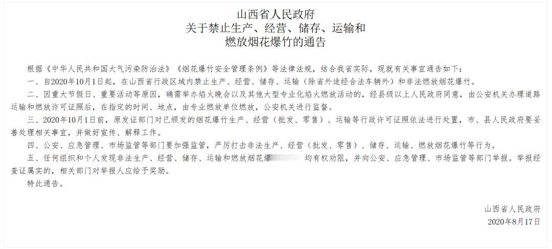 山西正式宣布废除烟花爆竹禁令,老百姓可以在春节等节假日燃放烟花了,李团长认为这是好事,一是增加了年味等喜庆气氛,更重要的是,可以刺激内需、扩大消费。预计其他禁放的多数省份会跟上解禁。保护环境,可不差这点烟花爆竹。