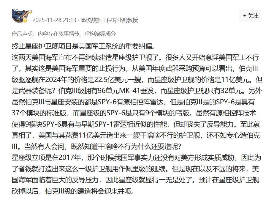 为了维护精神祖国的面子连自己的脸都不要,结果美国人打脸可狠了,这个人刚刚说星座护卫舰黄了不是美国军工不行了,而是美国的重要纠偏,美国海军不要没反导能力的星座级,预计在星座级护卫舰砍掉以后,美国会井喷建造伯克III级,结果才几天,伯克III级影子都没,美国海军又准备了新一代FF(X)护卫舰,其实就是在海岸警卫队的传奇级巡逻舰加了个拉姆导弹,这个FF(X)的项目名比星座级少了G(Guided Missiles制导导弹),没有G了,别说反导了,连防空能力都没了,这下不叫纠偏,而是继续偏,精神美国人永远比真正美国人对美国有信心,不过他看到是自己想象出来的美国。