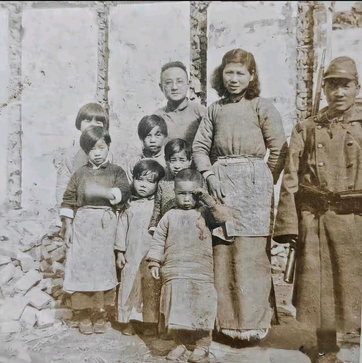日军与八口之家合影,枪不离身藏凶险,家人强颜难掩忧