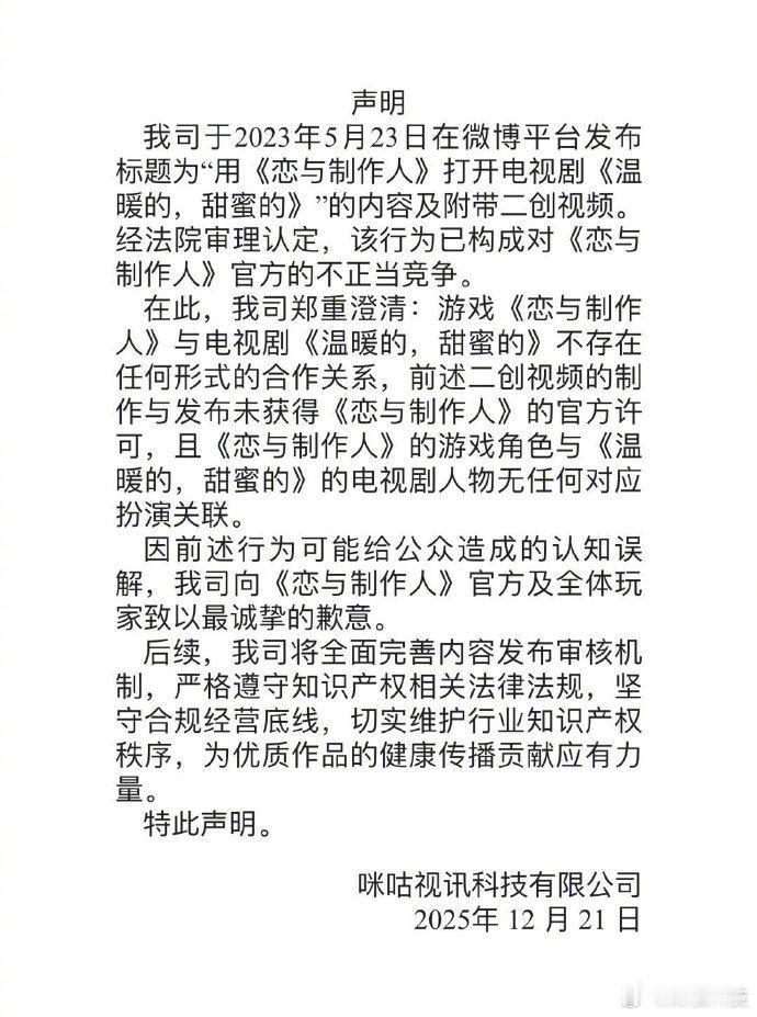 【咪咕对恋与制作人全体玩家道歉 】今日咪咕电影发布道歉公告,据了解,咪咕在2023年发布的一条二创宣传视频中,不仅使用了男性角色的角色名称,还利用《恋与制作人》的宣传PV、音乐、特效等原创素材进行混剪,并使用了游戏里角色的原版配音。叠纸在2023年提起诉讼,2025年12月宣布终审胜诉。叠纸维权两年胜诉以下为公告内容:我司于2023年5月23日在微博平台发布标题为“用《恋与制作人》打开电视剧《温暖的,甜蜜的》”的内容及附带二创视频。经法院审理认定,该行为已构成对《恋与制作人》官方的不正当竞争。在此,我司郑重澄清:游戏《恋与制作人》与电视剧《温暖的,甜蜜的》不存在任何形式的合作关系,前述二创视频的制作与发布未获得《恋与制作人》的官方许可,且《恋与制作人》的游戏角色与《温暖的,甜蜜的》的电视剧人物无任何对应扮演关联。因前述行为可能给公众造成的认知误解,我司向《恋与制作人》官方及全体玩家致以最诚挚的歉意。后续,我司将全面完善内容发布审核机制,严格遵守知识产权相关法律法规,坚守合规经营底线,切实维护行业知识产权秩序,为优质作品的健康传播贡献应有力量。特此声明。