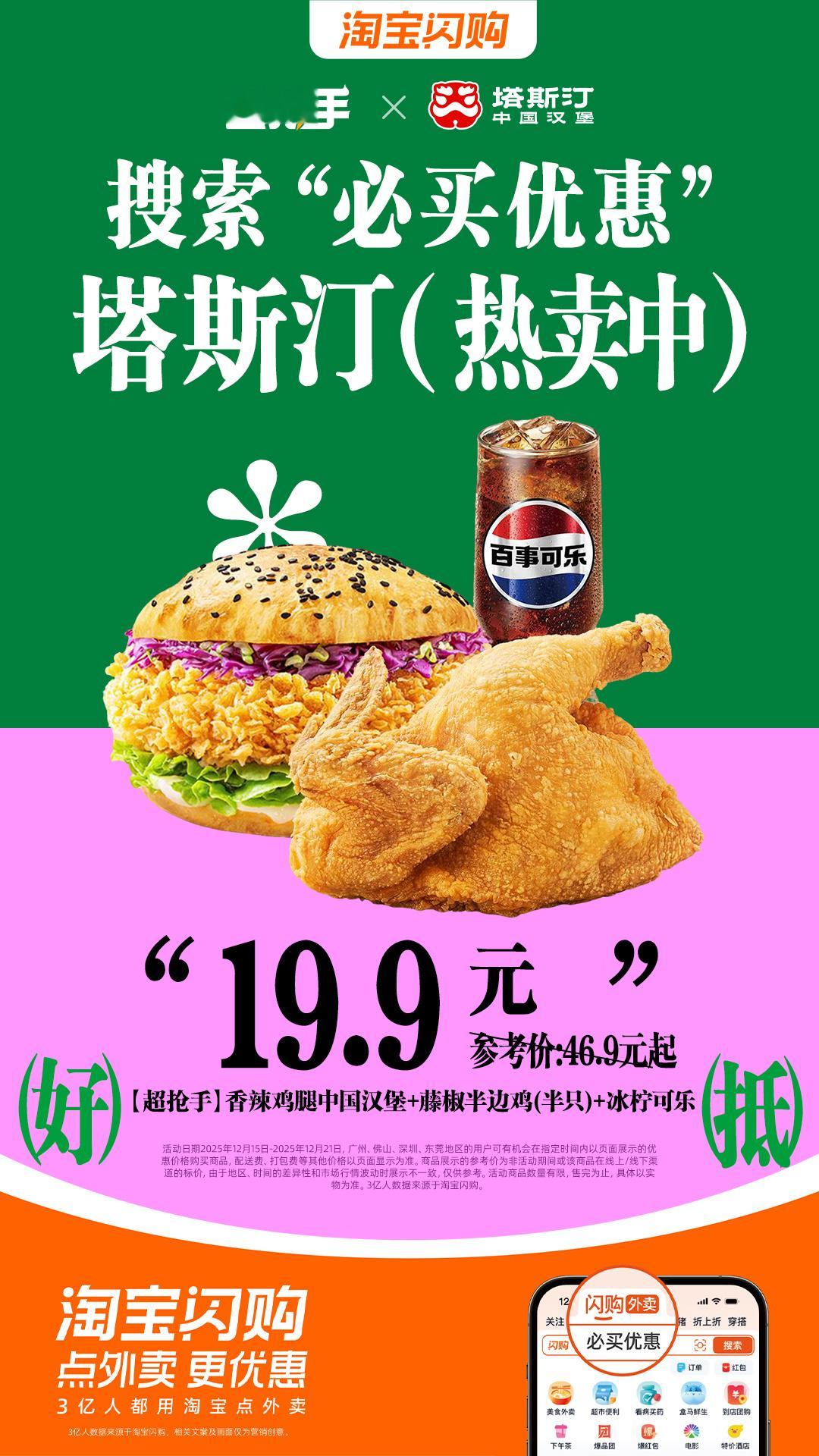 冬至饱餐一顿,午餐食塔斯汀最抵!塔斯汀香辣鸡腿中国汉堡X2+自选小食X2+冰柠可乐X2套餐 19.9元起,汉堡层层叠叠够满足,小食可口。同塔斯汀香辣腿堡+藤椒腿堡+翅根桶+自选饮品X2套餐 28.9元起,两个套餐都咁划算,风味各有千秋!上淘宝闪购搜【必买优惠】,大牌靓价19.9元起,下单塔斯汀实付满69元仲有机会兑换周边!锁定,塔斯汀让你天天吃点好的!