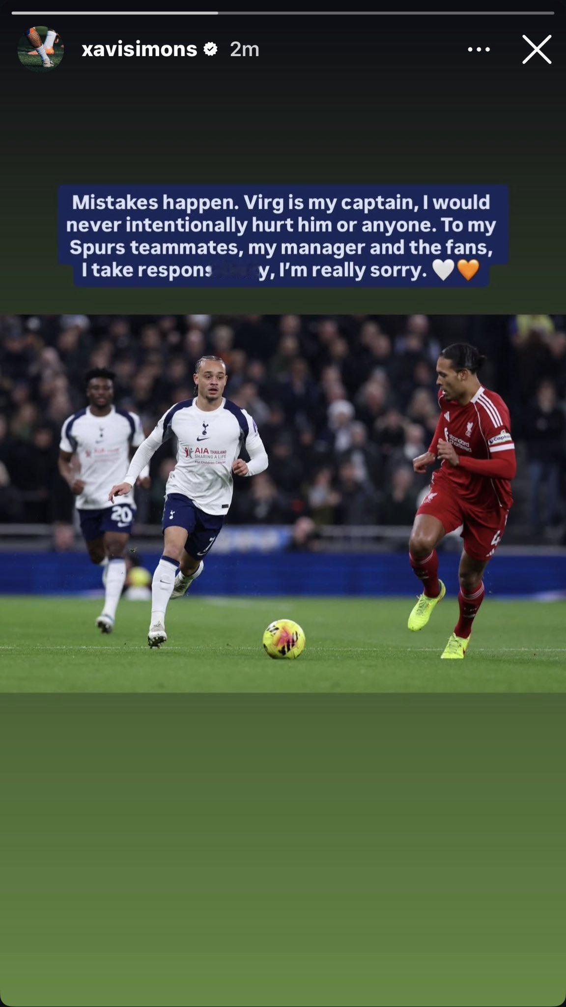 哈维·西蒙斯赛后在社媒就自己的红牌发文道歉:“人都会犯错。维吉尔是我的队长,我绝不会故意去伤害他或任何人。对于热刺的队友、教练以及球迷,我愿意承担责任,真的非常抱歉。”热刺1-2利物浦