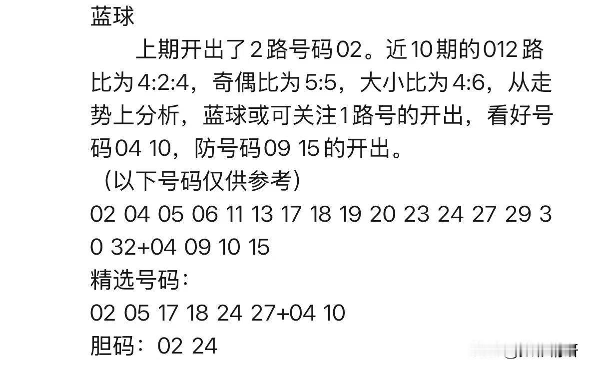 湖北辛丹丹带着她的幸运号码来啦!本期15+4精选组合新鲜出炉:红球02、05、17、18、24、27,蓝球04、10。细心的朋友会发现,红球05和24是上期重号,而17和18这对连码组合格外引人注目。辛丹丹特别看好红球02和24作为胆码,蓝球方面则重点关注04、09、10、15这四码,其中偶数04和10更是她的心头好——蓝球已经连续两期开出偶数,本期会延续这一趋势吗? 上期红球大底命中2个号码。期待辛丹丹本期再接再厉,冲击一等奖!对于今天的选号思路,大家有什么独到见解?欢迎在评论区畅所欲言,一起探讨幸运密码!