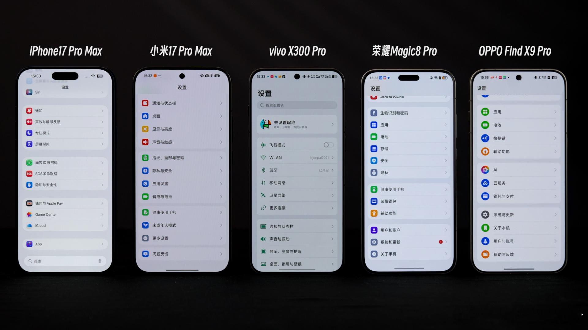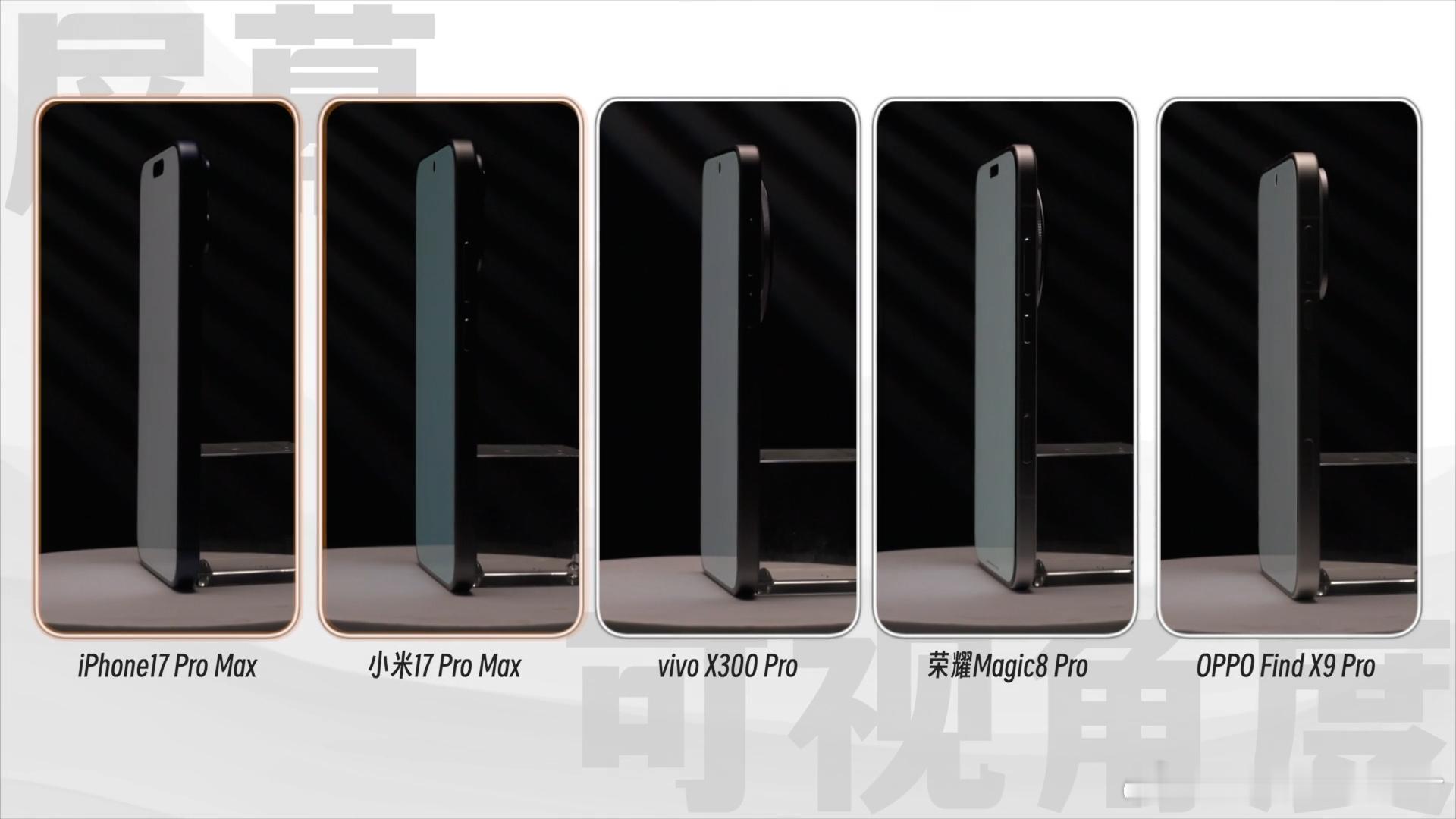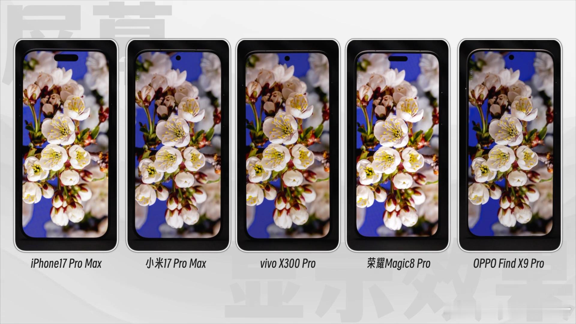 果米OV耀,五款Pro屏幕也正好来自五个供应商,也代表各家屏幕的最高水准。 iPhone17 Pro Max:三星M14米17 Pro Max:华星光电M10(超级像素)OPPO Find X9 Pro:天马天工屏vivo X300 Pro:京东方Q10 Plus荣耀Magic8 Pro:维信诺先看色彩(图1),iPhone一眼最好,三星屏在显示效果这块还是顶级。剩下四台手机其实差距不大,可能是因为荣耀更亮的原因,个人感觉更好一些。米OV,但总体差距并不大。通透度方面,图2均为手动最大亮度。这里先要说一下vivo,如果打开自动亮度,再手动把亮度开到最大,此时的亮度会比直接开最大亮度高很多。iPhone确实还是最好,荣耀和OPPO很接近,比较适中。小米和vivo则是一个偏暖一个偏冷。vivo、OPPO和小米都是1.1Xmm的窄黑边,观感确实更舒适。荣耀是唯一的2.5D,侧滑返回手感更好。其实屏幕好不好是一个比较综合的体验,和每个人的习惯也有关。个人感觉iPhone还是独一档,连三星自己都没用M14,先给果子上了,再加上多年的调校,综合体验顶级。同时国产屏幕进步明显,虽然不同品牌的的调校策略不同,但旗舰机基本都没有明显短板。央视曝光旧手机回收猫腻