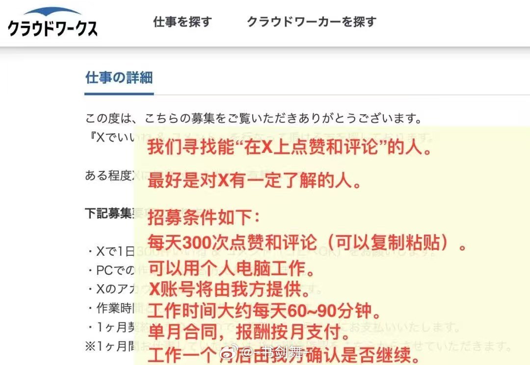 日网络水军发条视频最少2000日元日本大型众包平台CrowdWorks(云工作)被曝光长期发布招聘信息,付费征集制作“称赞日本、批评中国”主题的短视频,每条视频报酬最低2000日元(约合人民币90元),最高可达4000-7000日元。事件详情招聘内容:招募者要求视频制作者使用真实素材或AI生成内容,突出“日本技术、文化、日语的优越性”,并虚构或强调“中国人的扰民、不文明行为”等负面情节。部分招聘还涉及为右翼政客(如高市早苗)制作宣传或解读视频。 🎥平台情况:据日本《朝日新闻》调查,一个发包方从2024年11月到2025年11月至少发布了14条类似招募。事件曝光后,这些信息被转为非公开。 🎥报酬标准:脚本撰写1500-5000日元,视频剪辑/完整制作2000-7000日元。鼓励长期合作,可“加薪”。 🎥日本反应:许多日本网民在社交平台上抗议,标签如“抗议CrowdWorks”流行,批评这是“操纵舆论”“右翼舆论制造机”。有网民质疑平台与自民党等保守势力有关联(平台服务过政府部门,公司CEO获官方表彰)。 类似案例:日本另一平台Lancers也曾出现招募“保守派”写手的信息。TBS电视台节目采访过接单大学生,他们承认“为钱而做,不在意真相”,极端内容更容易火。海外新鲜事