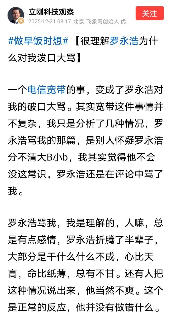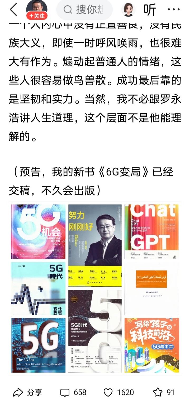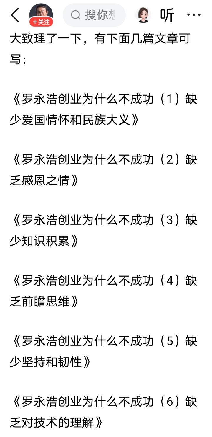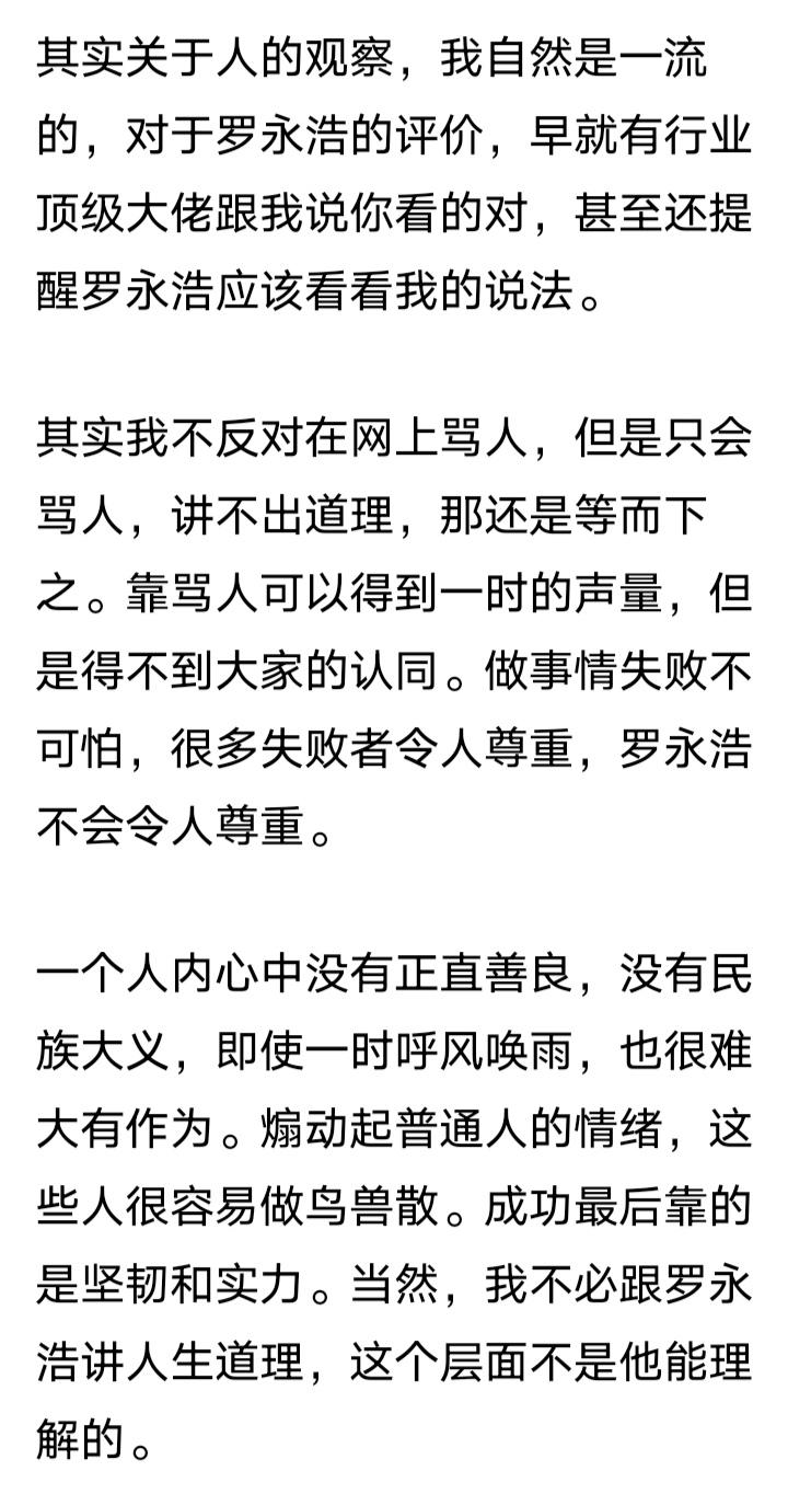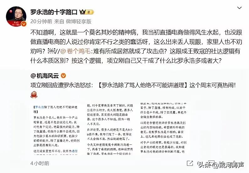看来罗永浩和项立刚这场网上打口水战,一时半会还停不了。不过说到底都是流量惹的祸,怼来怼去都是生意呐! 我这可不是瞎说啊,你看项立刚最新这篇回怼罗永浩的贴文,前面读的很爽,到了文末,冷不丁插入一支新书即将发布的广告,你看看,这生意不就来了吗?这么一怼,有热度又能够顺手插入一支广告,多高明! 再看罗永浩那边,时不时就要整出一些话题来。为什么?因为他是做电商直播的,想要电商的流量好,你就得保持较高的关注度,所以他要保持一个热度,于是时不时要挑起一些话题让吃瓜群众去围观、看热闹。 吃瓜群众把氛围烘托到位了,他的关注度就高了。这样一来他直播的时候去看热闹的人也就多了,看热闹的人多了总会有那么一些人顺手买他所推销的商品,所以生意就这么滚起来了。老罗一看用这种法子屡试不爽,而且卓有成效,于是就反复循环,所以咱们每隔一段时间就会看见一些由老罗带起来的话题在网上发酵。 然后,其他大V看到老罗那边有流量了,也想来蹭一蹭,于是就像老项那样,你说我两句我怼你三句,大家互相怼,怼来怼去把氛围搞起来,结果是咱们吃瓜网友看了一个热闹,而他们大V之间收获一波流量,韭菜割了一茬又一茬。 总而言之,就是各得其所吧,所以依我看,在网上这种带货互怼,谁也不要标榜谁比谁高明,谁比谁高尚,说到底不过是为了生意罢了,只是手段各不相同而已。