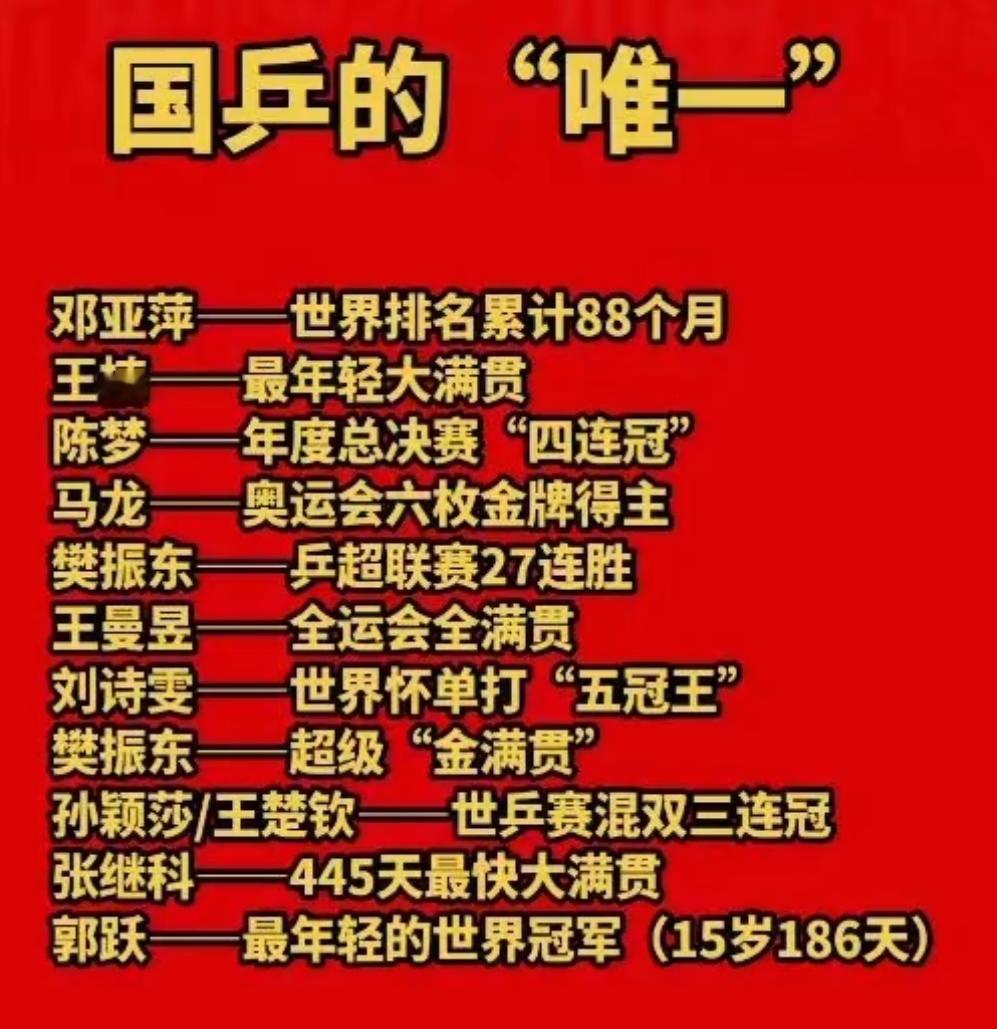 详细了解国乒的“唯一”——孙颖莎孙颖莎双圈世锦赛金满贯 女乒唯一 邓亚萍—世界排名累计88个月, 王楠最年轻的大满贯, 陈梦年度总决赛四连冠, 马龙,奥运会六枚金牌获得者, 樊振东乒超联赛27连胜, 王曼昱是全运会全满贯! 樊振东是超级金满贯, 孙颖莎/王楚钦是世乒赛混双三连冠! 其实王楚钦最棒, 亚运会四金王, 目前没有人超越, 所有的荣誉都代表过去, 乒乓球运动员有一句话特别好, 下了领奖台之后一切归零, 所有的荣誉都代表过去, 运动员的成绩都是拼出来的, 经得起岁月洗礼, 王楚钦第一个左手世乒赛冠军🏆, 孙颖莎/王楚钦第一块混双 奥运金牌, 现役运动员未来无限可能, 2026,国乒运动员继续加油, 继续创造出属于自己的辉煌业绩!