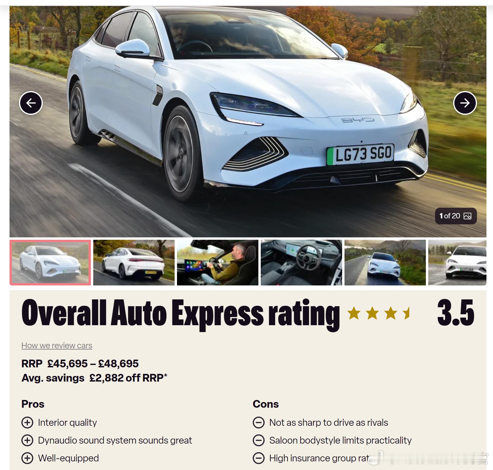 来看看外媒是如何评价比亚迪海豹的优点:内饰质量好、丹拿音响效果好、配置很高缺点:操控不够犀利、实用性欠佳、保险费用高补充一点:这车在英国的起售价为45695英镑,约合人民币43万多