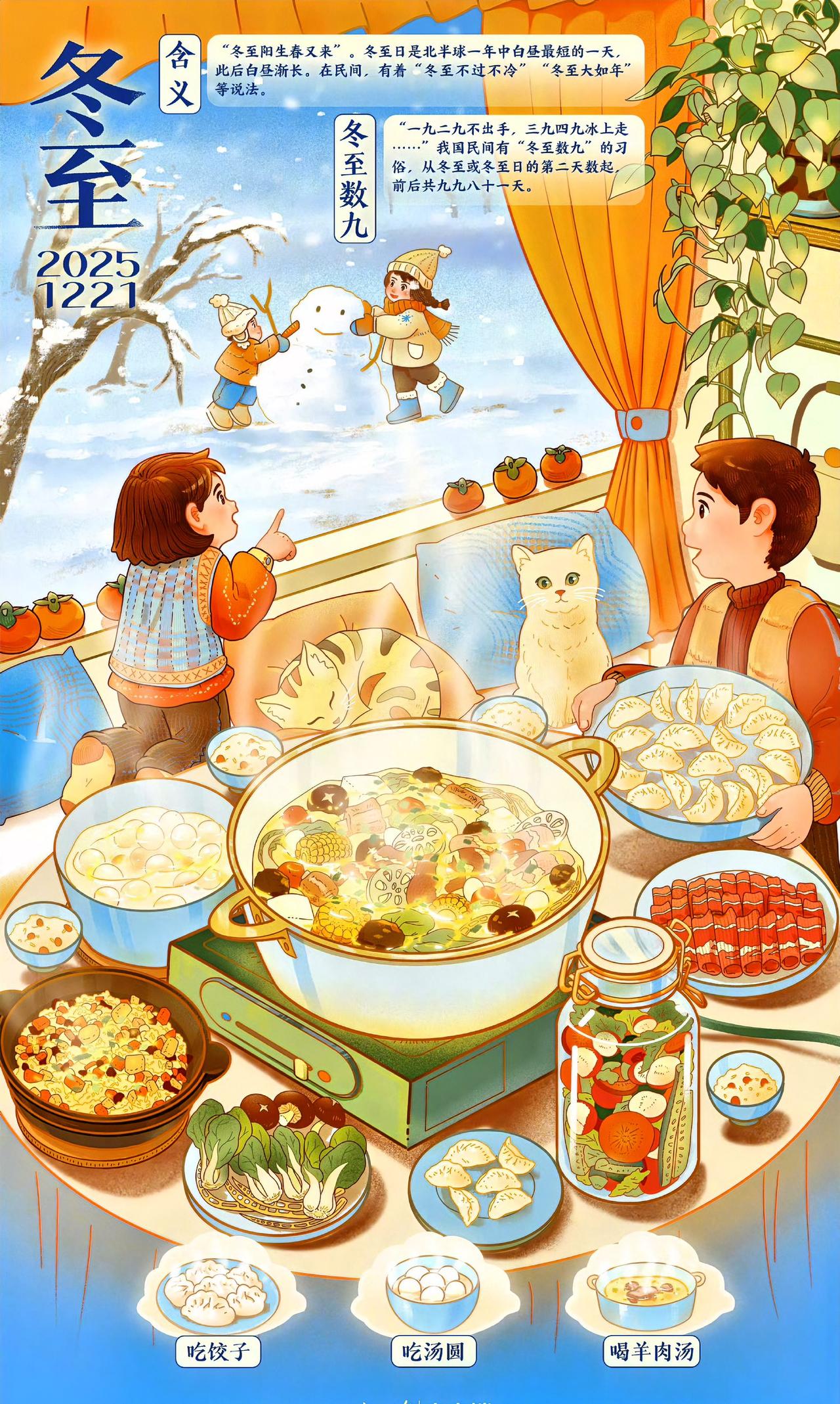 今日恰逢冬至。“一九二九不出手,三九四九冰上走……”我国民间向来有“冬至数九”的传统习俗,从冬至当天或次日开始计数,前后共计九九八十一天。饺子、汤圆、羊肉汤……冬至之际,吃些热气腾腾的美食,让生活也跟着“暖”起来吧! 冬至数九