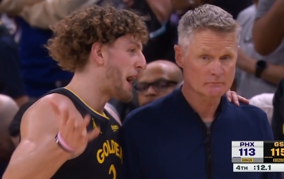 波杰抢下关键篮板,然后搂着科尔,不知道在说啥,这小子是不是平时就这么经常给科尔洗脑太阳vs勇士