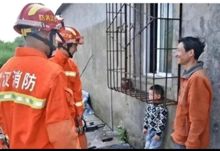 一个轻松的救援场景! 一个顽皮的小孩被护栏卡住了,不过除了小孩本人,大家都忍俊不禁,很开心,包括孩子的父亲!
