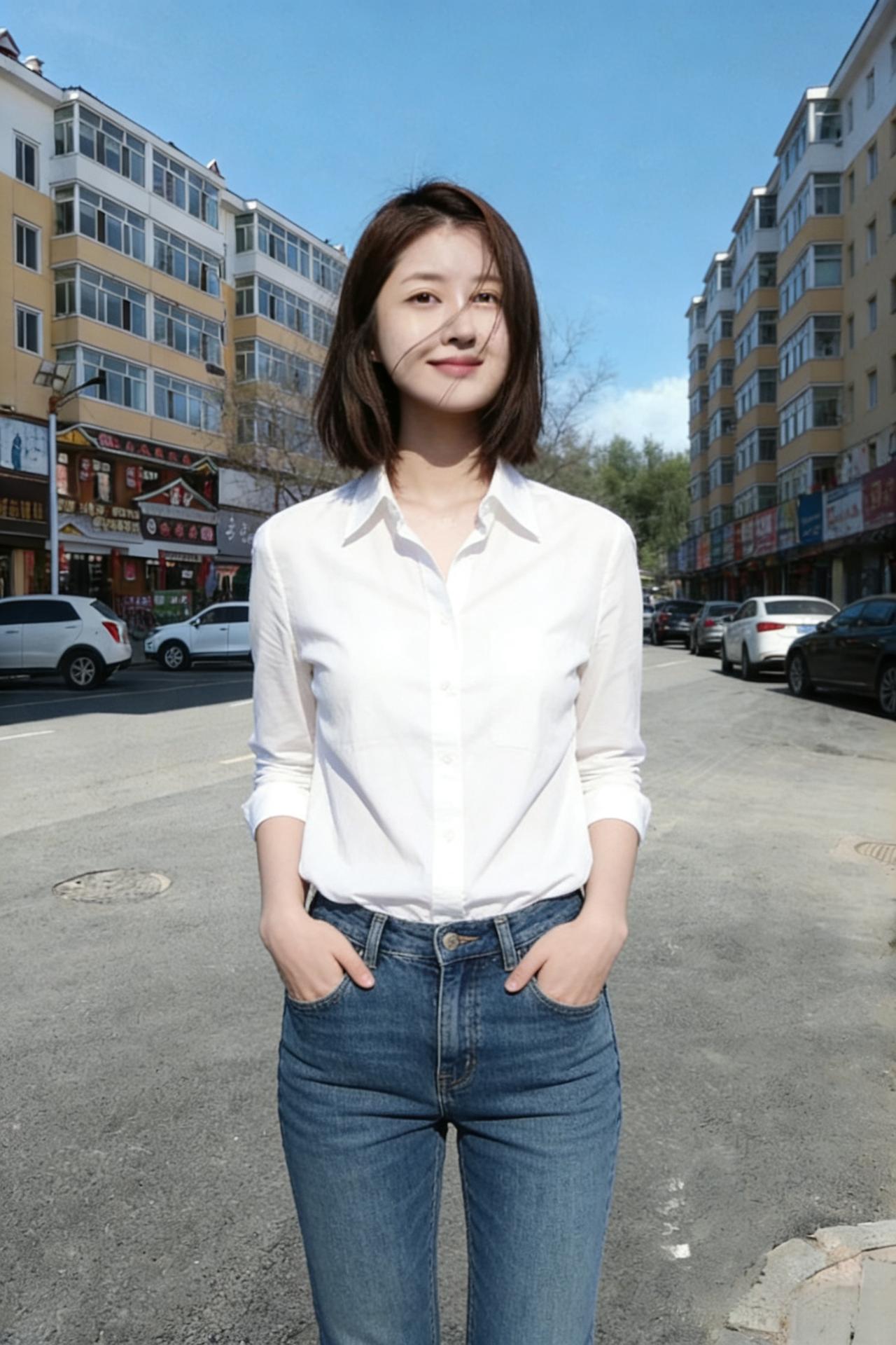 长街晴日丽,高厦入云悠。 素袂迎风举,清颜带笑柔。 鬓丝牵晓雾,裙裾漾春流。 尘客纷驰过,悠然自凝眸。