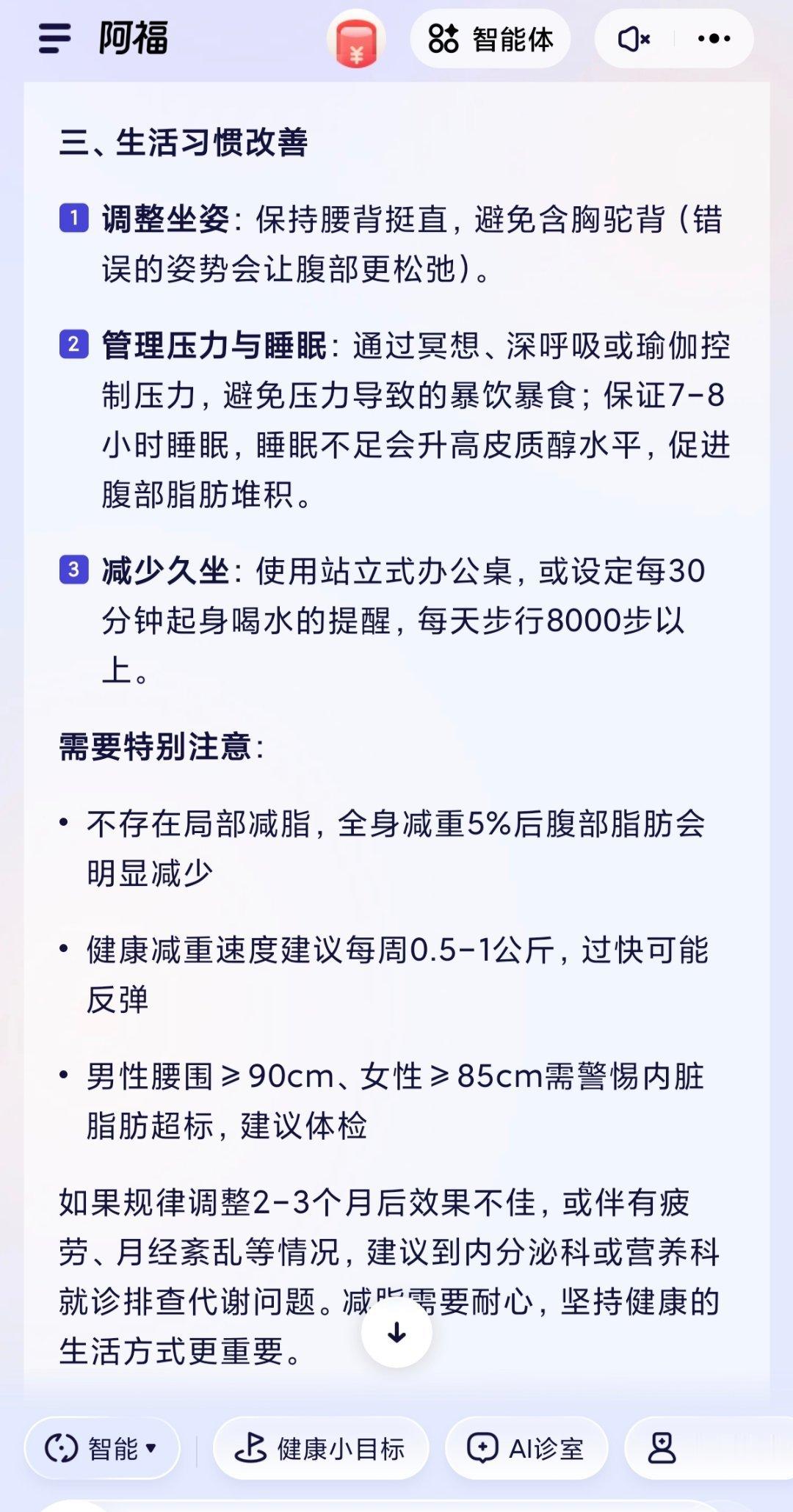 这个减肥搭子我是真的想要 家人们谁懂啊,加班族三餐本就不规律,身材更是严重走形,天天嚷着要减肥,但就是管不住嘴迈不开腿,也不知道该怎么健康饮食。直到我遇上蚂蚁阿福这个神仙工具!拍照或上传身材照片,一键解锁全方位解读。作为常年和肚腩死磕的打工人,踩过的坑能绕地球半圈——健身卡积灰到过期、减脂操跳废膝盖、节食饿到啃枕头…直到遇上蚂蚁阿福,才发现减肚腩居然能“躺赢”!蚂蚁阿福最戳我的点:不制造焦虑、不搞极端计划,把大目标拆成小任务,让减肥融入日常。不用节食、不用虐自己,每天花10分钟,轻松和肚腩说拜拜~