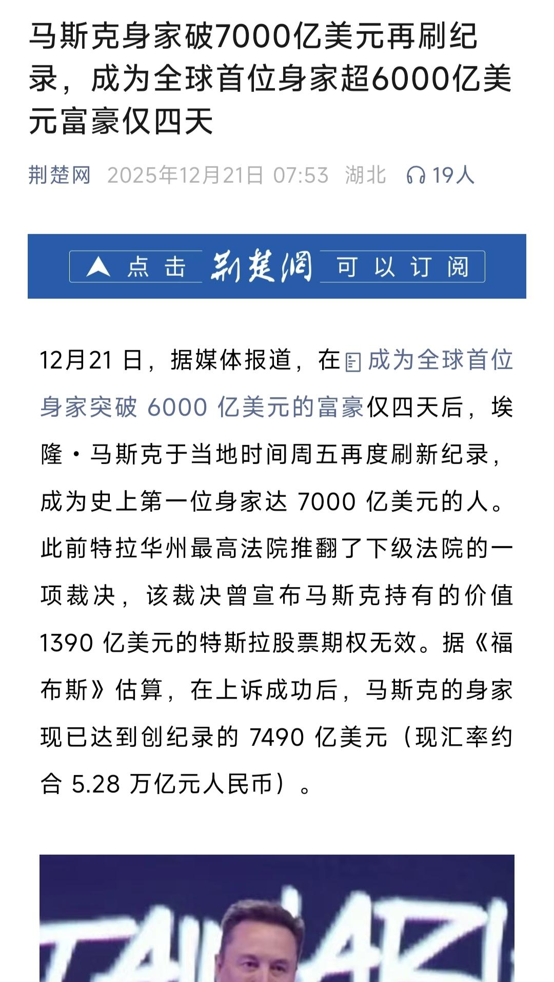 马斯克最新身价 7490 亿 美元 折合人民币 5.28 万亿 人怎么可以牛X成这样? 马斯克 世界首富马斯克