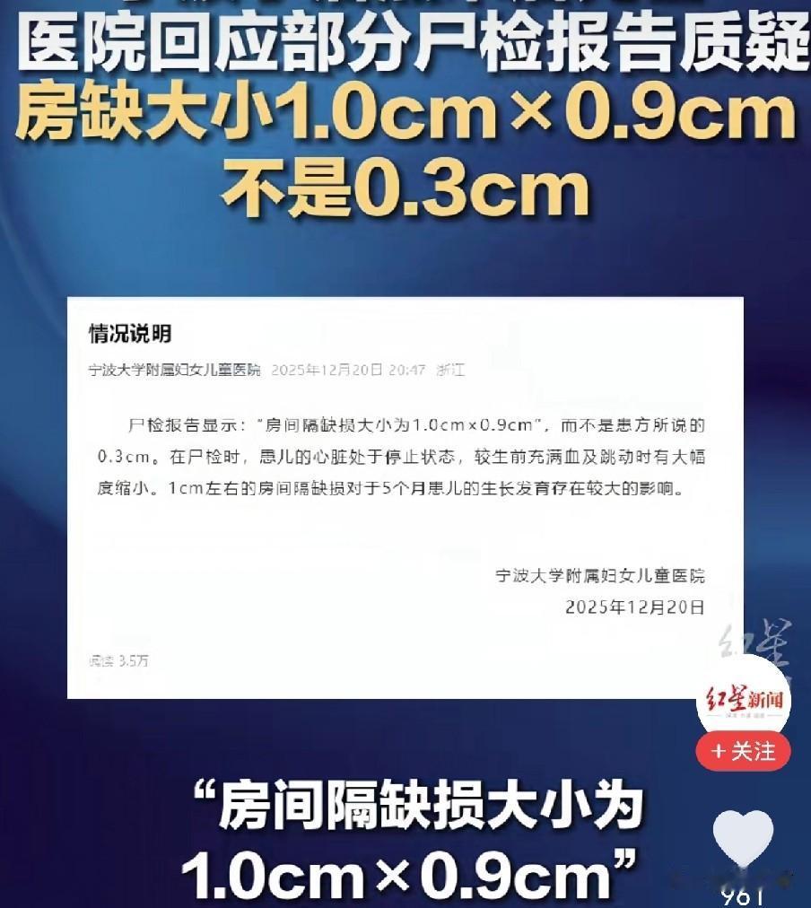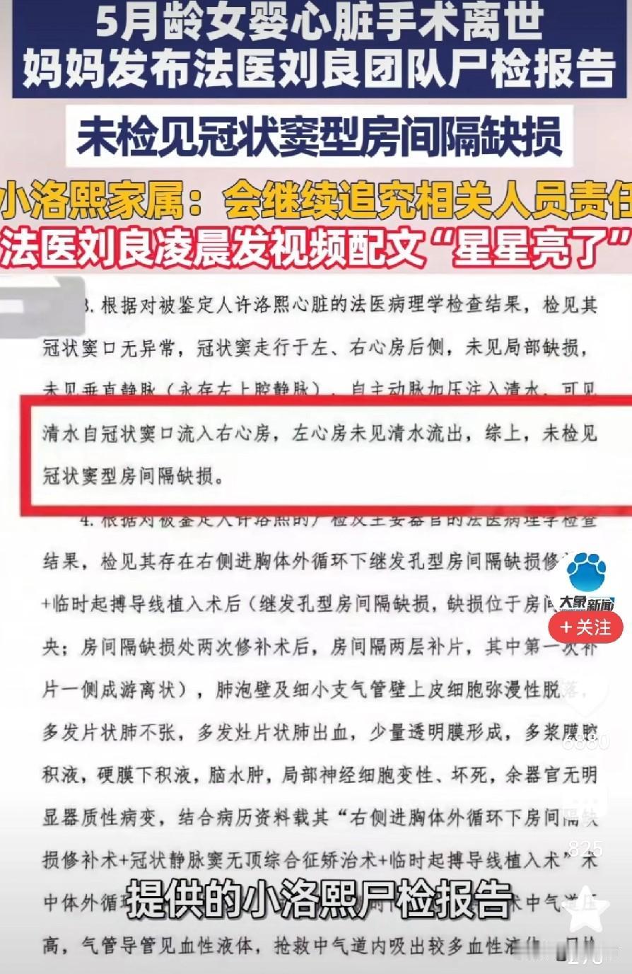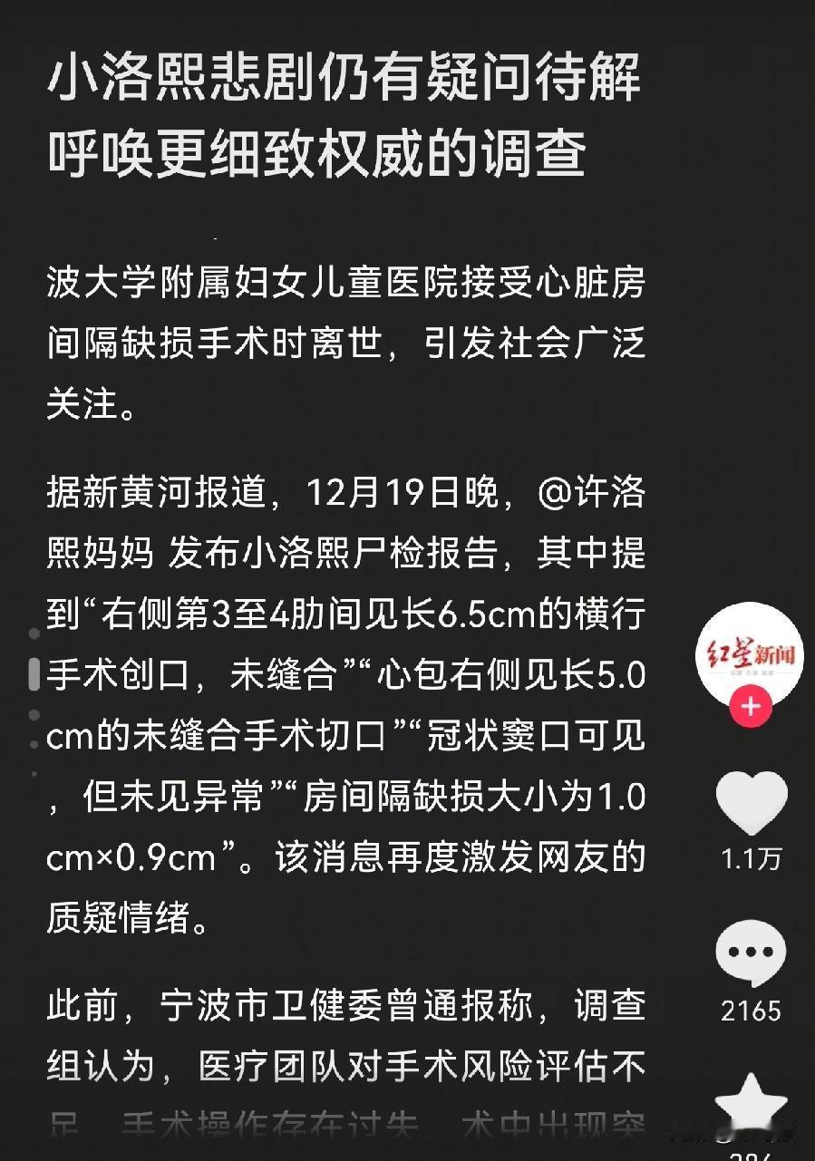 五个月大的早产儿“小洛熙”,原本应该看着美好的世界等待长大,在她的父母身边呀呀学语,可就因为一次医疗事故,才那么小的孩子,和这个世界告别了。 11月14日,宁波某医院,一场被医生告知只需要2.3个小时的微创手术,却足足进行了7个小时,直到手术灯的关闭,小洛熙也永久的闭上了眼睛。一个月后,一场“过度医疗”引发了争议,孩子的母亲一直走在维权的路上,直到一位法医的鉴定报告,彻底撕开了这场医疗的遮羞布。 法医报告显示孩子肋骨间切开的伤口都没有缝合,就匆匆把皮外伤口缝合了。连长期从事医疗救助的韩红也发文表示,这个医疗事故错的太离谱了,甚至尸检报告表达,孩子的心脏问题都没有医院说的那么严重。很多人说这个小问题都没有做手术的必要,可以等孩子长大点才观察,这么小就承受这些,太可惜了。 这起悲剧,不仅是一个家庭的破碎,更敲响了医疗行业的警钟。该如何杜绝此类医疗悲剧的发生?东方卫视主持人说的太震撼人心了, “一个小生命的逝去不应该只是一则新闻,而是推动医疗制度的自我革新”。 (图片来自网络视频)