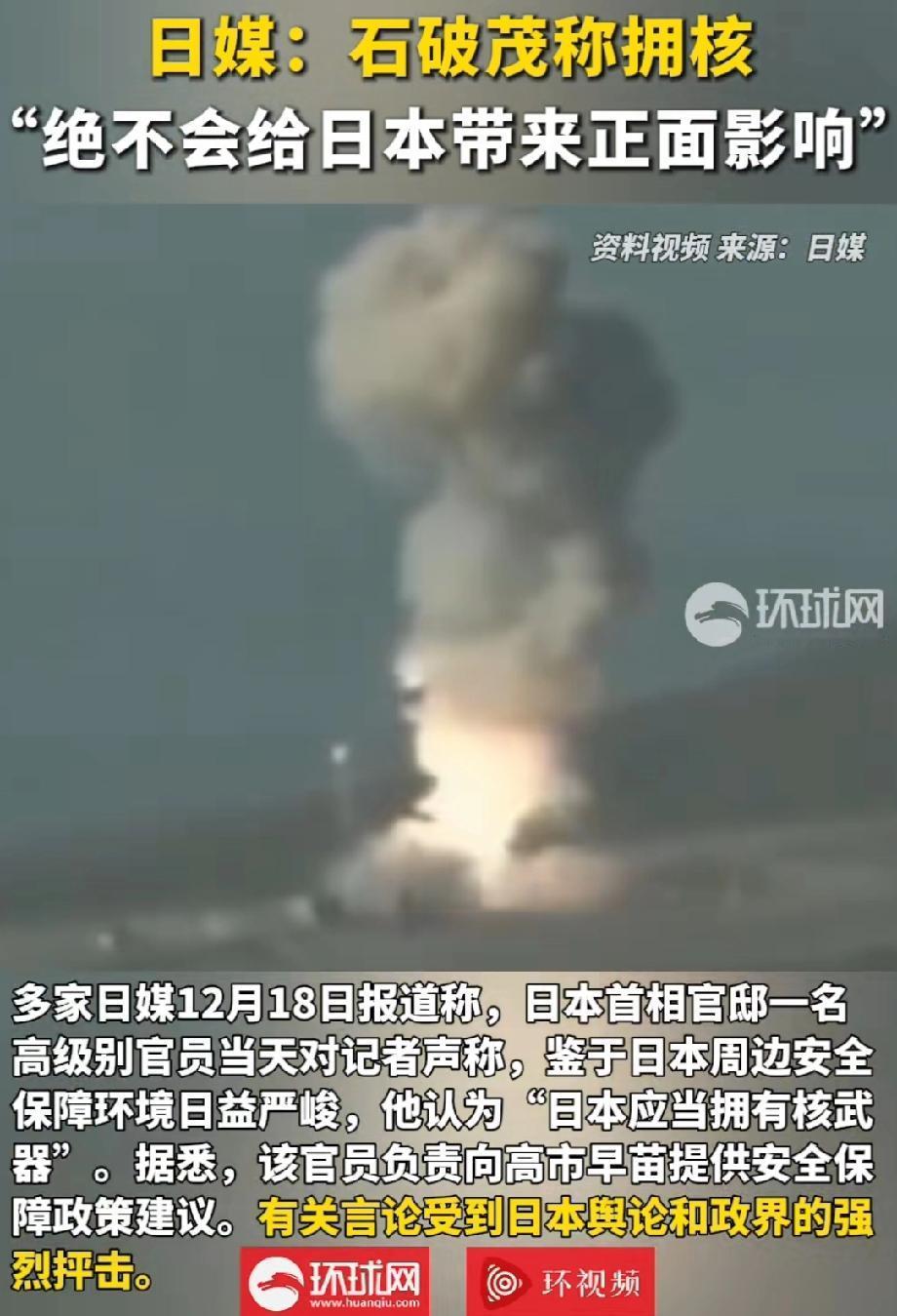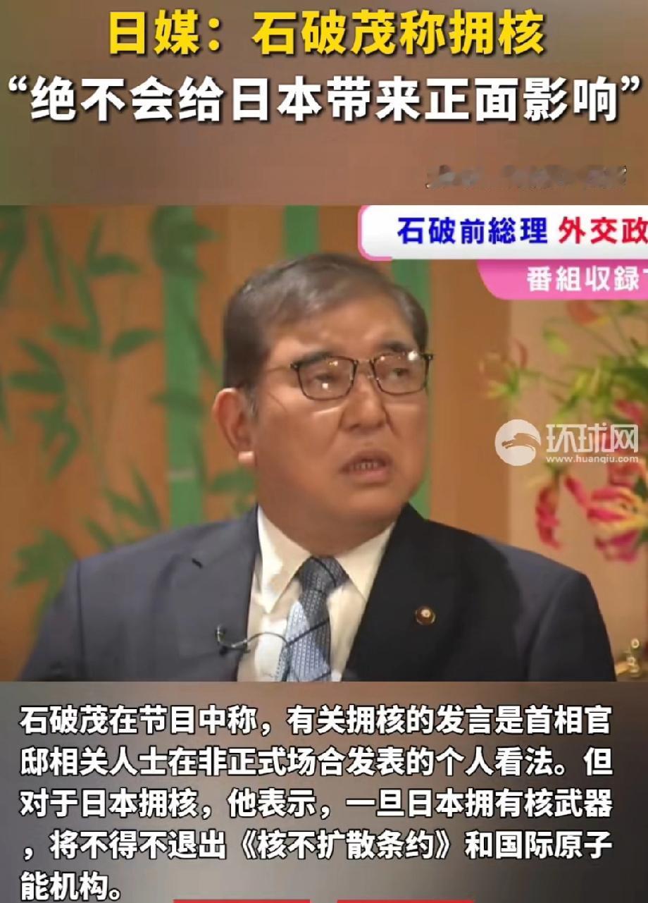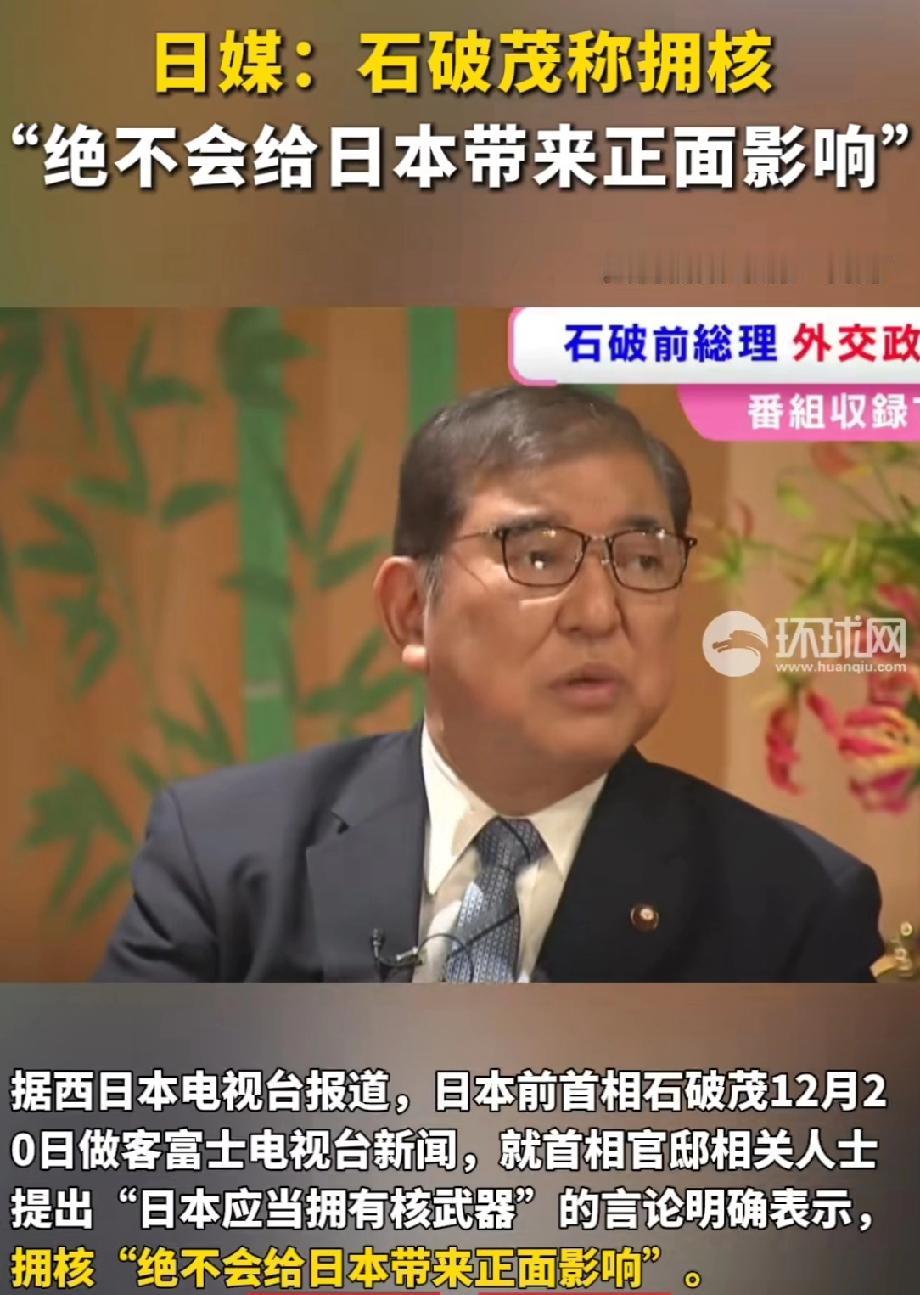 石破茂:拥核不会给日本带来正面影响 。日本这是又整出幺蛾子了。12月18日多家日媒报道,首相官邸一高级别官员称鉴于周边安全环境严峻,日本应拥核。这言论一出来,就遭到日本舆论和政界强烈抨击。公明党党首齐藤铁夫觉得在广岛、长崎核爆80周年之际说这话,简直“震惊和愤怒”。 好在前首相石破茂12月20日明确表态,拥核“绝不会给日本带来正面影响”。他指出,拥核就得退出《核不扩散条约》和国际原子能机构,还会让核能政策难以为继。看来还是有人头脑清醒,日本要是真拥核,那可真是自讨苦吃。
