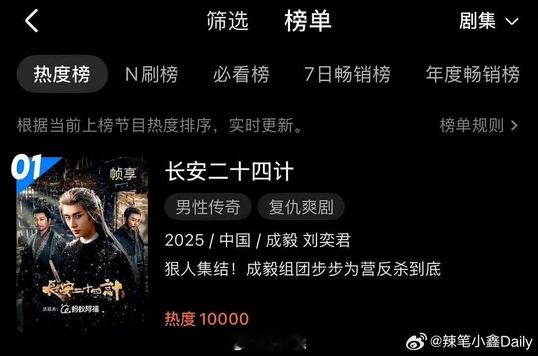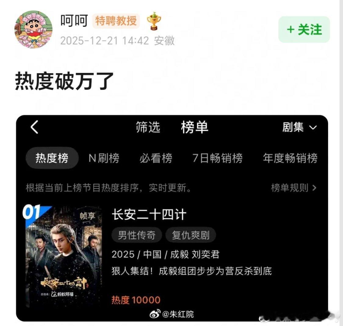 成毅《长安二十四计》热度破万了,恭喜成毅🎉恭喜谢淮安!🎉