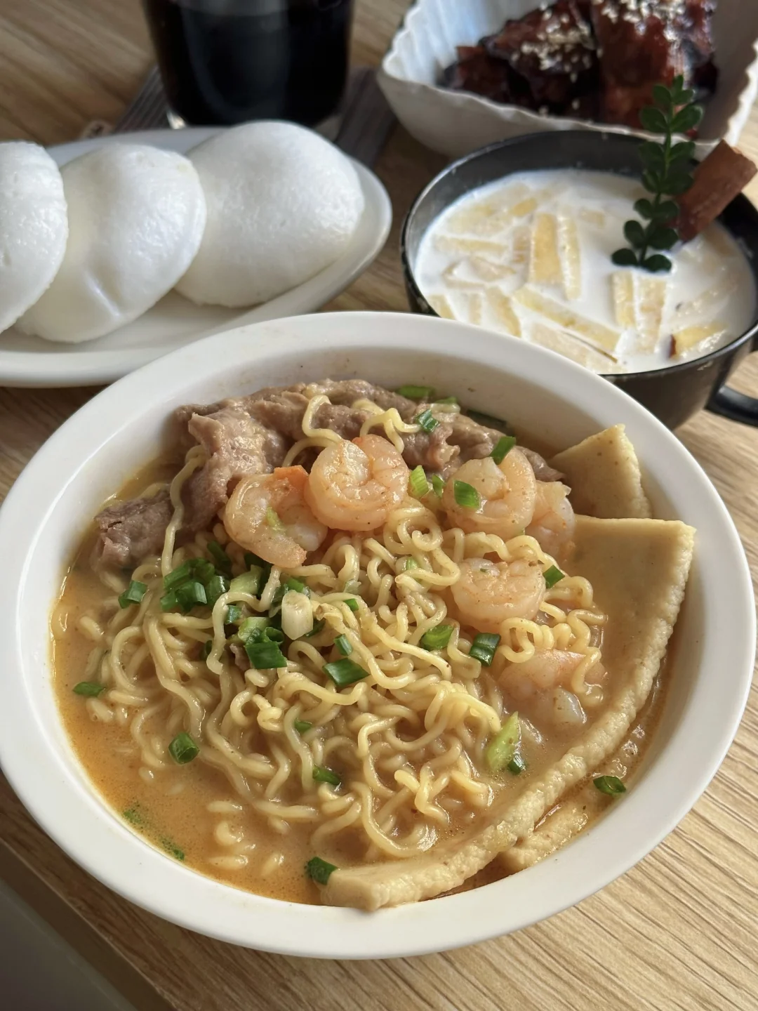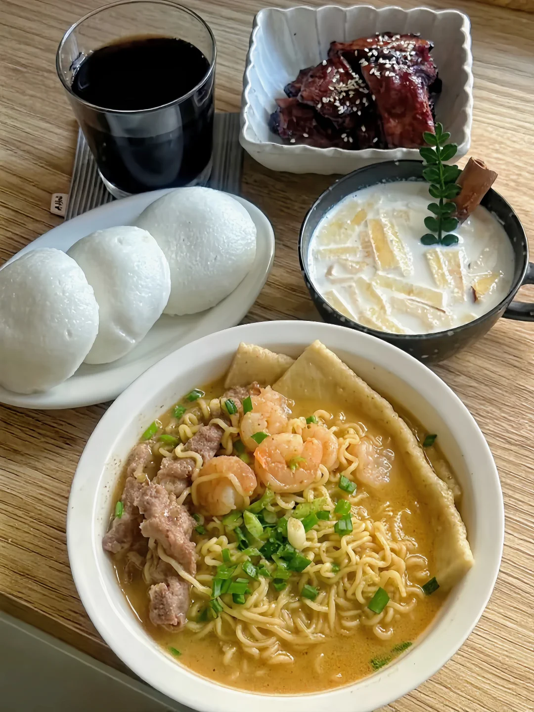 今日早餐:🍤虾仁肥牛沙茶面🍎苹果炖奶