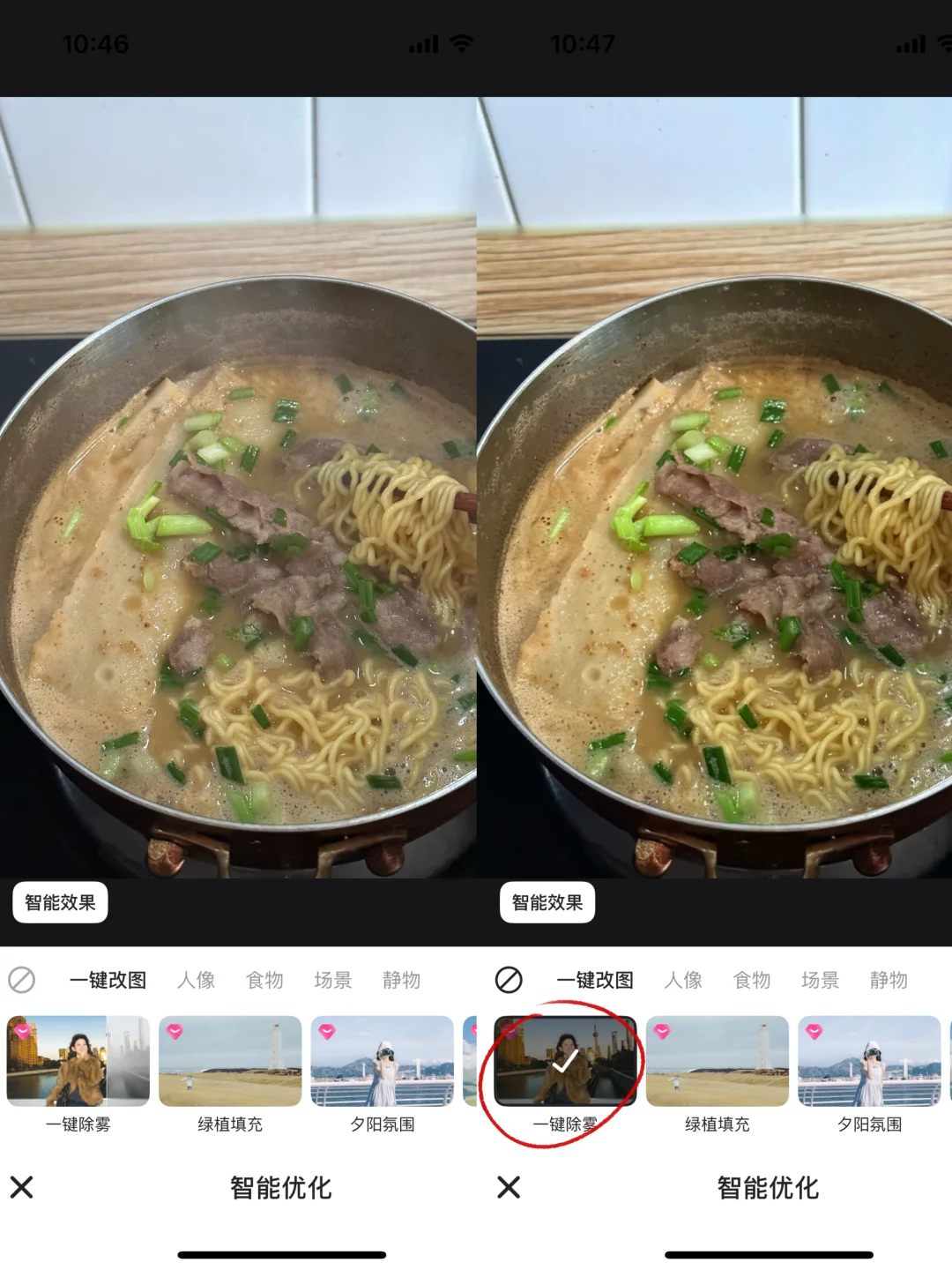 🤦水汽、热气,还有没擦干净的镜头,简直是美食拍照的“隐形杀手”,不过没关系,这种废片还有救!我常用的这个 「一键除雾」还挺好用的,点一下,照片瞬间就透亮清晰了!