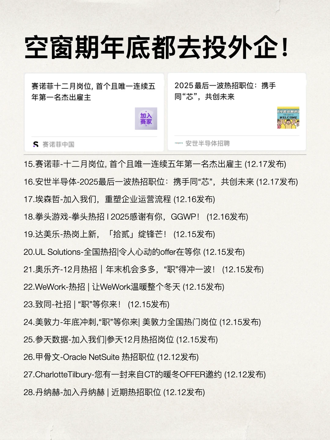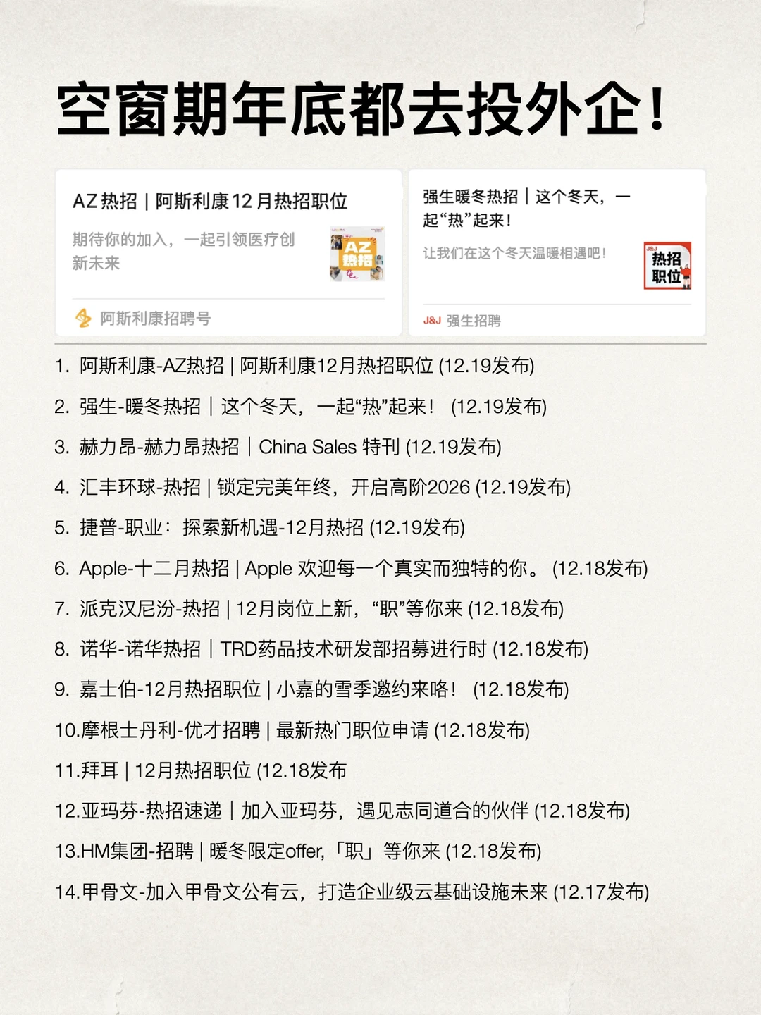 这两天更新岗位的时候,有被这个信息量吓到,年底了,外企反而越招越猛。大大小小的外企都在发找人公告,完全是“来不及整理”的那种程度 . 而且外企是很值得去的,空窗期的不要错过 ▪️福利稳、节奏轻 ▪️年假普遍 12–20 天 ▪️很多都是 955 / 弹性到岗 ▪️还有餐补、交通补贴、海外培训这种很有诚意的福利 . 没想到年底反而成了窗口期,这波机会,是真的可以冲冲。 . 坚持日更✊🏻,对外企感兴趣的欢迎常来看看 .