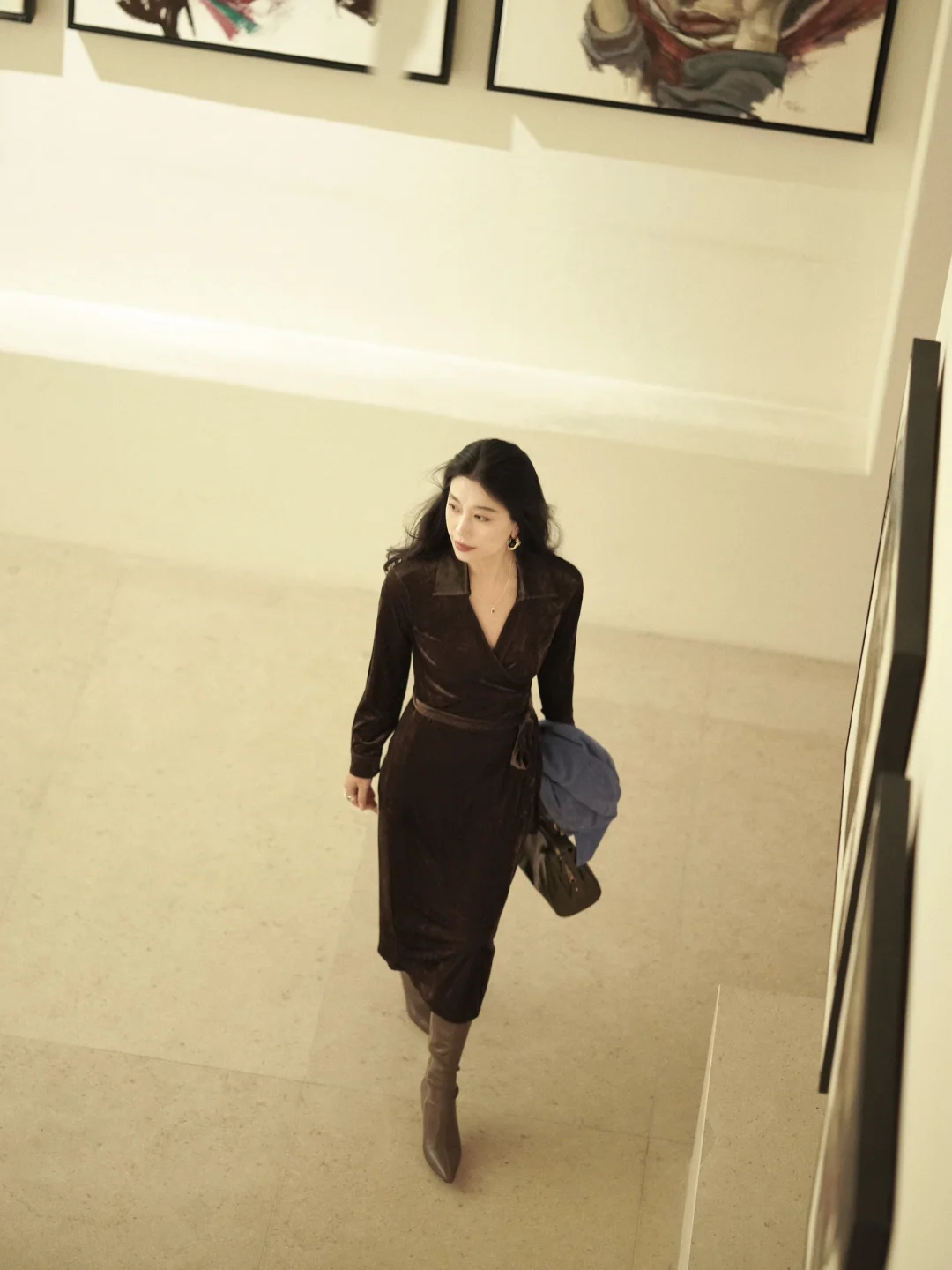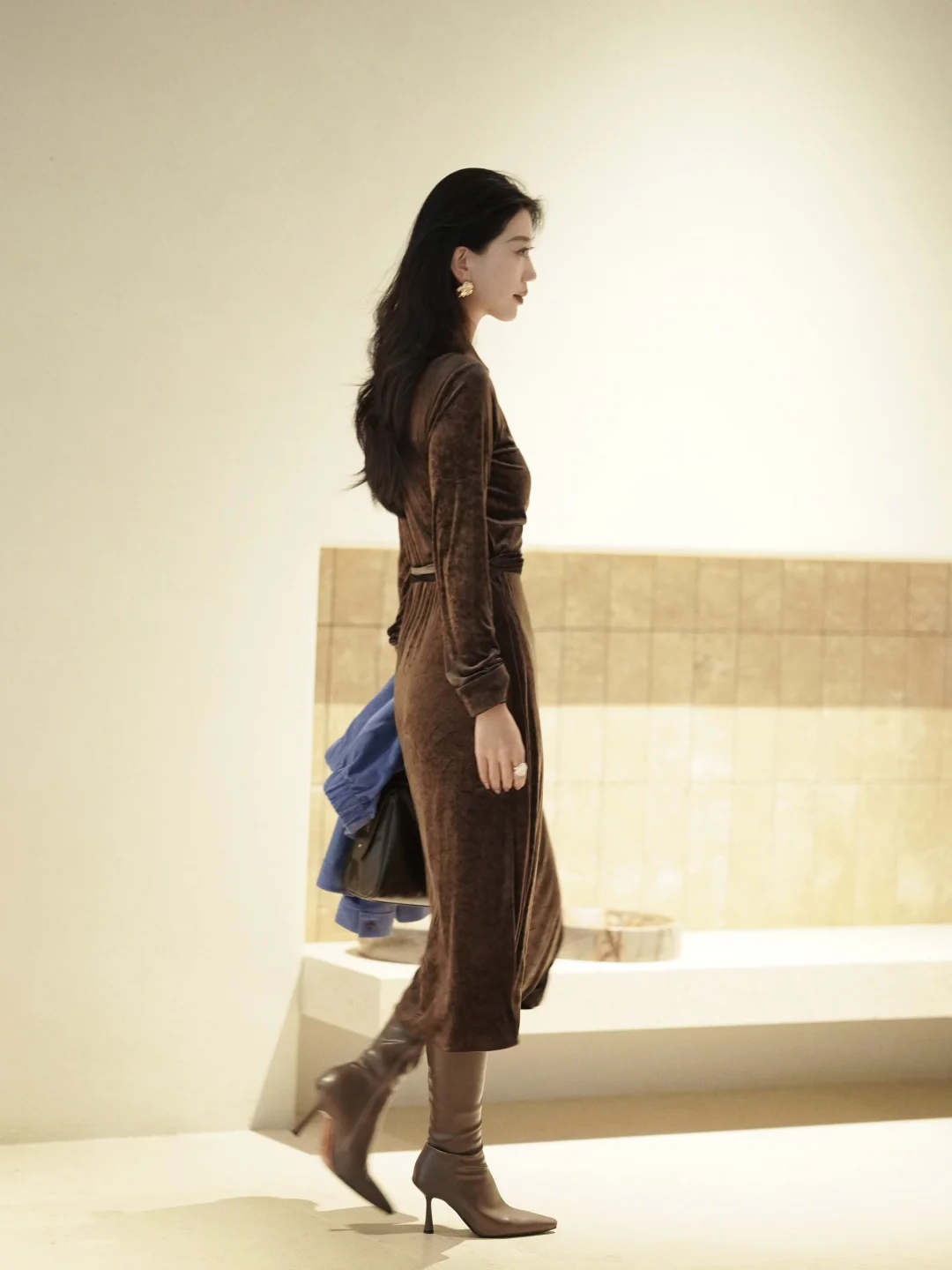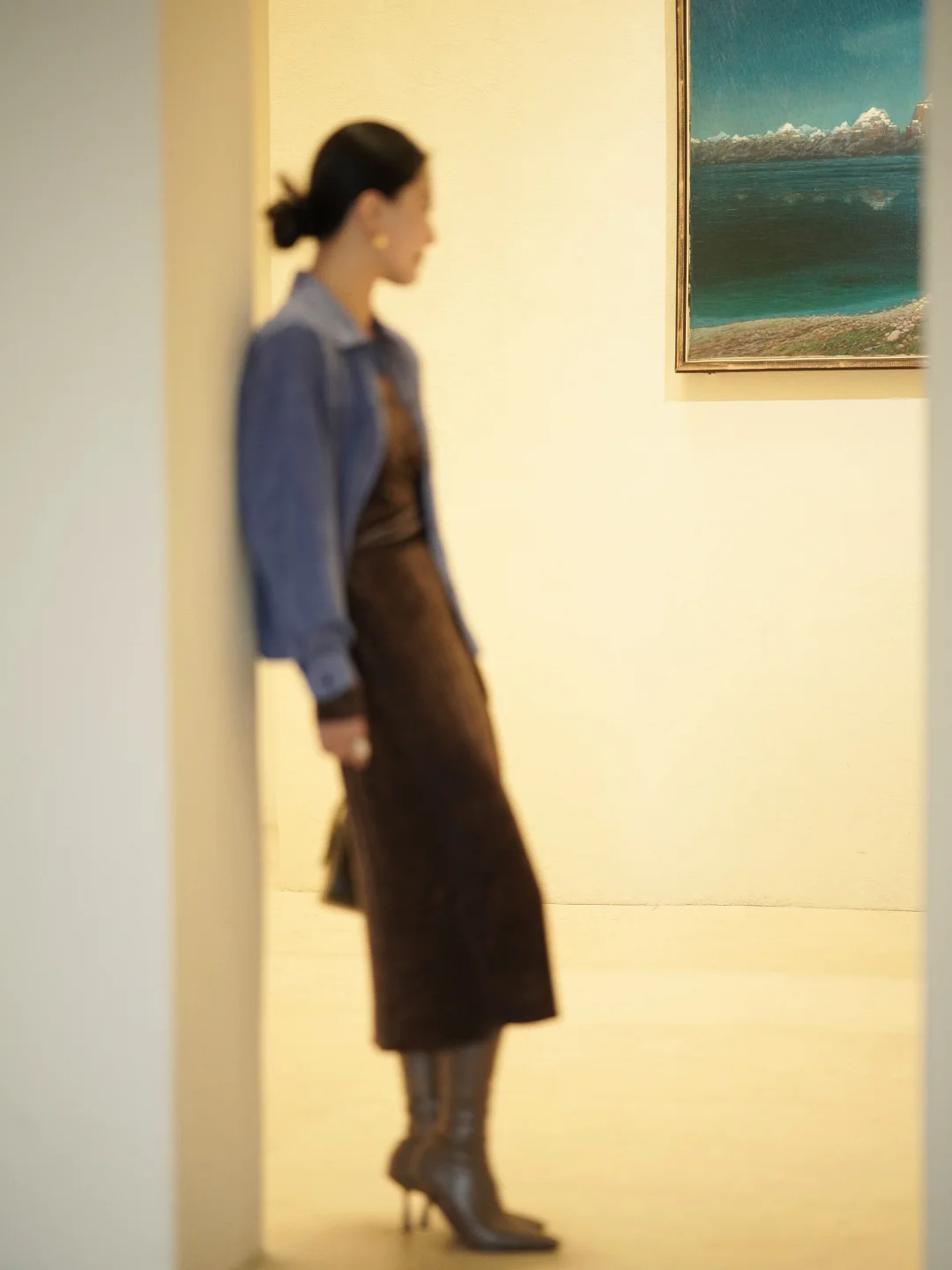 午后,丝绒裹身裙垂坠出日落深色调,穿过写字楼旋转门时,皮衣恰好接住中央空调的冷意。这身装扮本身便是深思熟虑的结果——当柔软向刚毅发出邀请,面料的对谈就开始了。