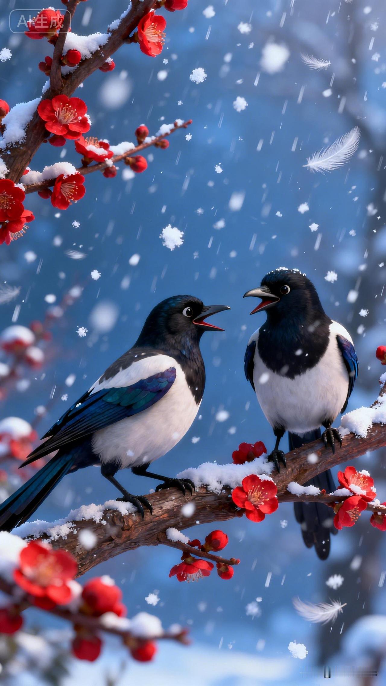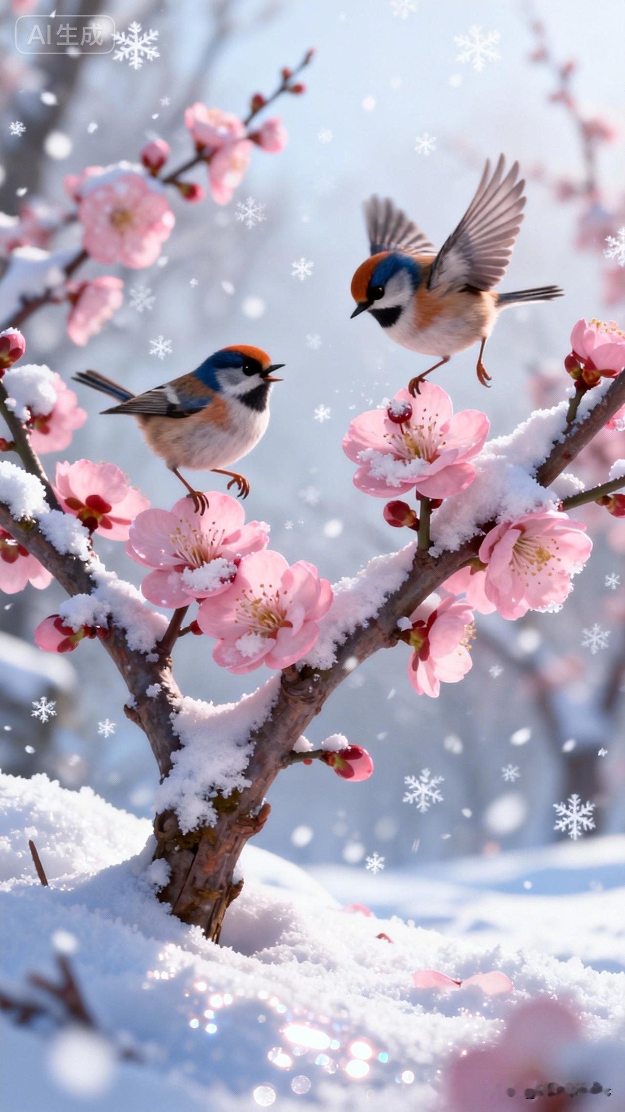 梅园春雪 朔风卷雪落寒林,千树凋零万径深。 独有梅梢凝艳色,粉英疏影破琼沉。 冰枝未改春风态,玉蕊犹含冷月心。 忽有双雀栖碧干,一衿蓝翠一冠金。 蓝雀振羽啼清越,红顶啾鸣意未任。 似诉霜天寒彻骨,又言梅蕊暗香侵。 雪片沾翎浑不觉,花光映羽自相寻。 世间荣谢皆尘事,且向枝头共醉吟。 寒英傲雪年年在,野鸟知春岁岁临。 莫叹冬深无胜景,梅边雀语是清音。雪梅傲影 雪梅风景 雪梅枝头喜鹊闹