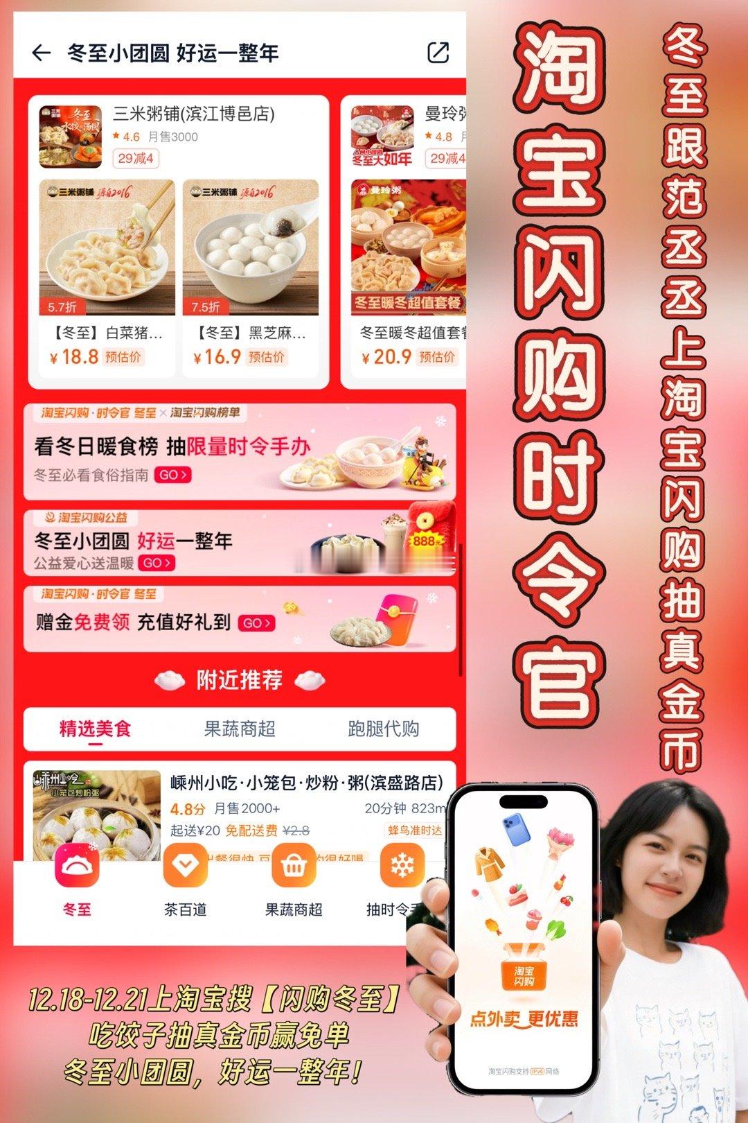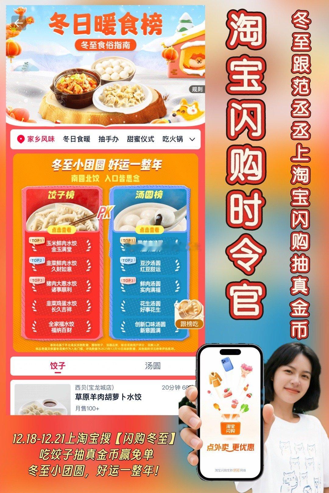 冬至跟范丞丞上淘宝闪购抽真金币淘宝闪购时令官 🥟🥟冬至小团圆,好运一整年刚看完淘宝闪购的冬至创意短片,我整个人都被治愈了!🎬 一群“成精”的饺子在屏幕里翻滚跳跃,虾、排骨、青菜大家都团聚一堂🥟✨ 食材们仿佛都有了生命,饺子过安检的时候被发现了,原来冬至饺子里真的有金币!就这么被一群食材洗脑了。短片中,食材们互相拥抱,冬至的饺子,包住的是思念,煮开的是团圆。冬至小团聚,好运一整年。这不正是每个中国人冬至最深的情感共鸣吗?🥟🥟🥟🥟🥟🥟🥟🥟🥟🥟✅这个冬至,让淘宝闪购带你团圆看了淘宝闪购的短片,我立刻上淘宝闪购搜索【闪购冬至】,抽真金币——惊喜发现活动正热火朝天!🔥📅 12月18日至21日,每天都有品牌好物闪购💰 吃饺子抽真金币,还能赢免单大奖🎁 范丞丞同款冬至好物、各地特色美食一应俱全✅冬至下单抽真金币,赢范丞丞亲签✅冬至手办✅范丞丞周边✅冬至抱枕✅各种无门槛红包、代金券👍还有冬日暖冬榜,提供了南圆北饺榜单,一口气满足你的所有需求,入口即思念。无论你是想买速冻饺子解思乡之情,还是选购杭州知味观的定胜糕送亲友,或是想入手一套精美餐具提升冬至仪式感,这里全都有!更妙的是,即使不能物理团聚,也能通过“分享购物车”功能与家人云端选购同一款美食,隔空共赴舌尖上的团圆。🥟🥟🥟🥟🥟🥟🥟🥟🥟🥟杭州的冬至,别有江南韵味。老杭州人讲究“冬至大如年”,除了全国流行的饺子,还有这些特色。🍚 赤豆糯米饭家家户户必做,用红豆驱疫避邪,糯米温补御寒。🎋 定胜糕荷花形状,寓意节节高升,常与饺子同食,取“交好运”之意。🐑 冬酿酒配羊肉三五好友小聚,一杯甜醇冬酿,一碗热腾羊肉,祛寒暖心。🍀记得小时候,外婆总在冬至前夜准备赤豆饭,她说:“吃了这饭,整个冬天都不怕冷。”灶台上蒸汽氤氲,红豆香混合糯米甜,那是童年最扎实的温暖。🌷视频里,妈妈举起刚包好的元宝饺;屏幕前,我桌上的赤豆饭热气袅袅。她笑说“吃了不冻耳朵”,我展示粉嫩的定胜糕。屏里屏外,笑声与香气早已撞个满怀,提醒我们——纵隔千里,今夜吃下的是同一种叫做“家”的味道。 🏮冬至的白昼最短,思念却最长。 愿每一只饺子都包裹牵挂,每一口热汤都融化乡愁。这个冬至,让我们在淘宝闪购相遇,用美食缩短距离,用关爱温暖寒冬。记得哦:12.18-12.21,淘宝搜索【闪购冬至】,吃饺子抽真金币赢免单! 🥟💰❤️祝每一个努力生活的普通人,都能匹配属于自己的幸运,发出属于自己的光。