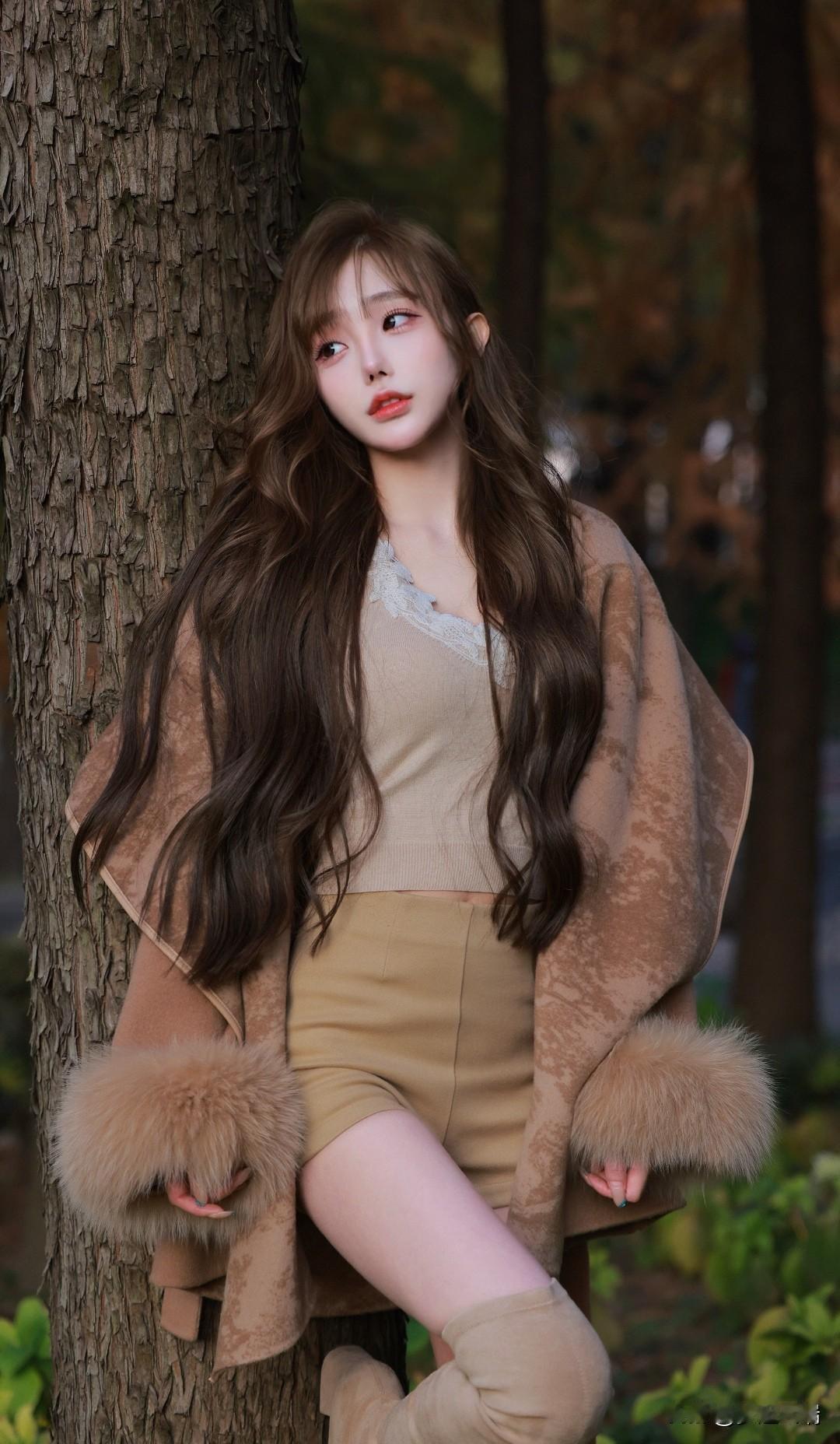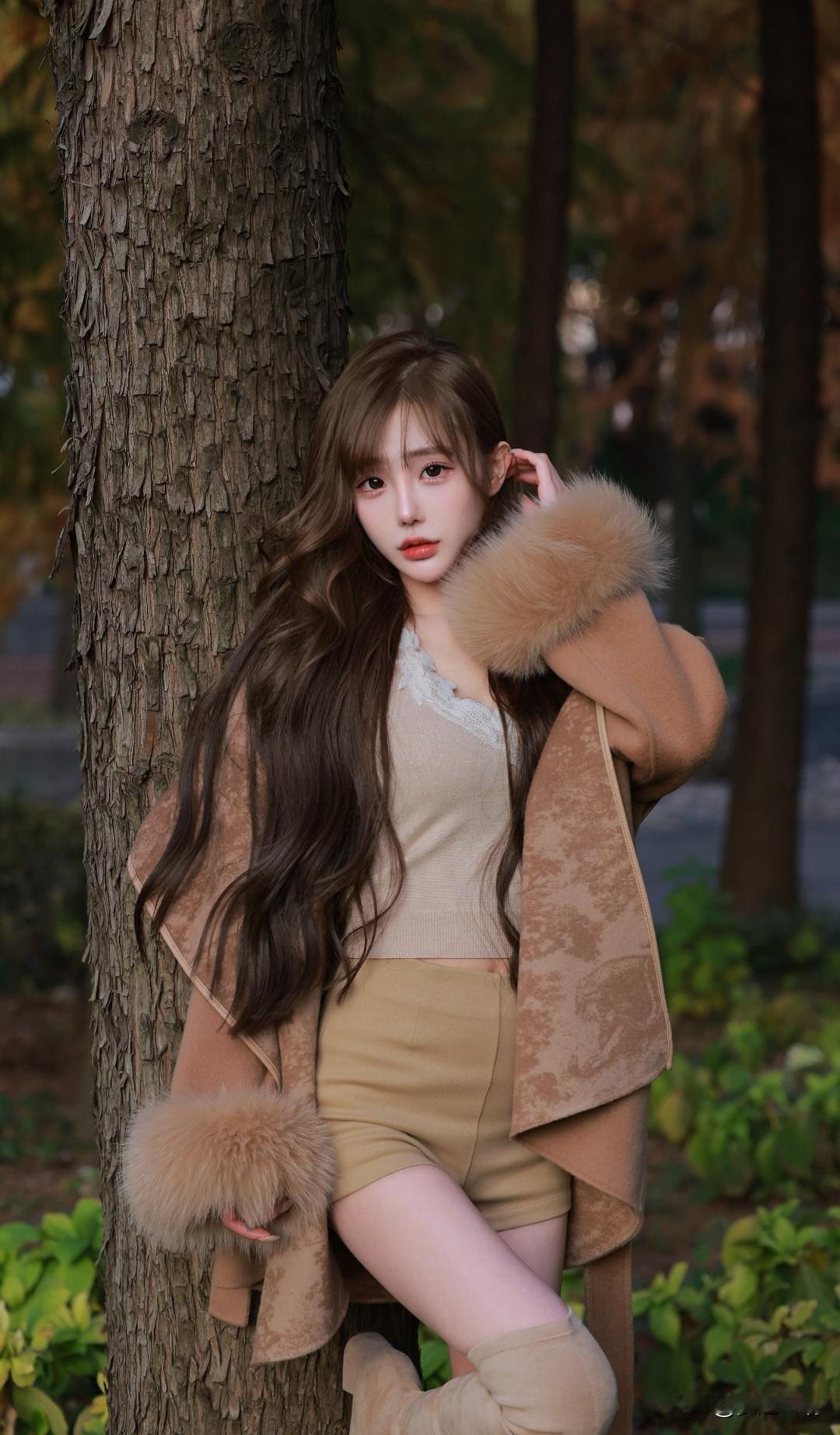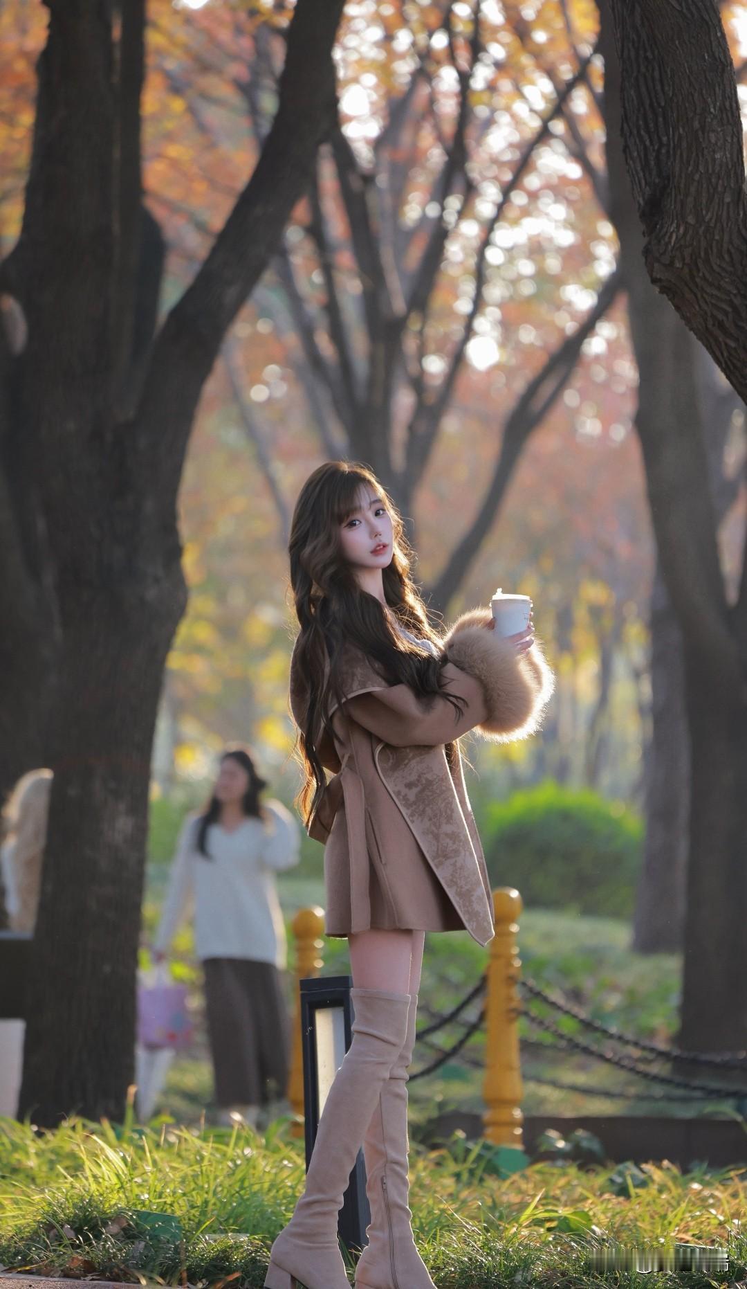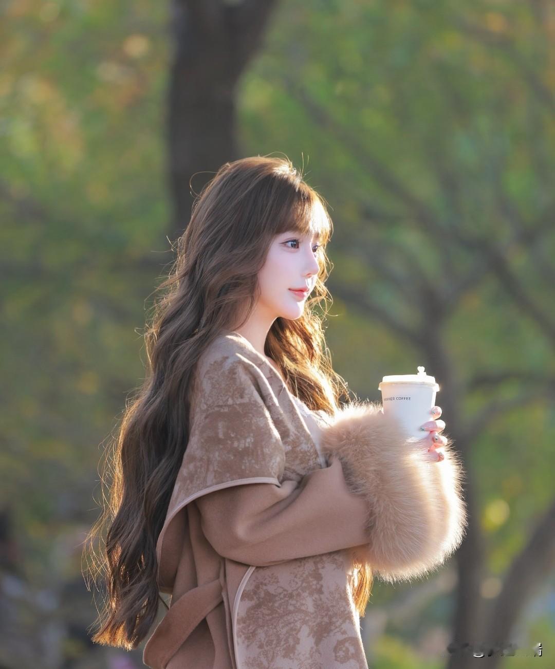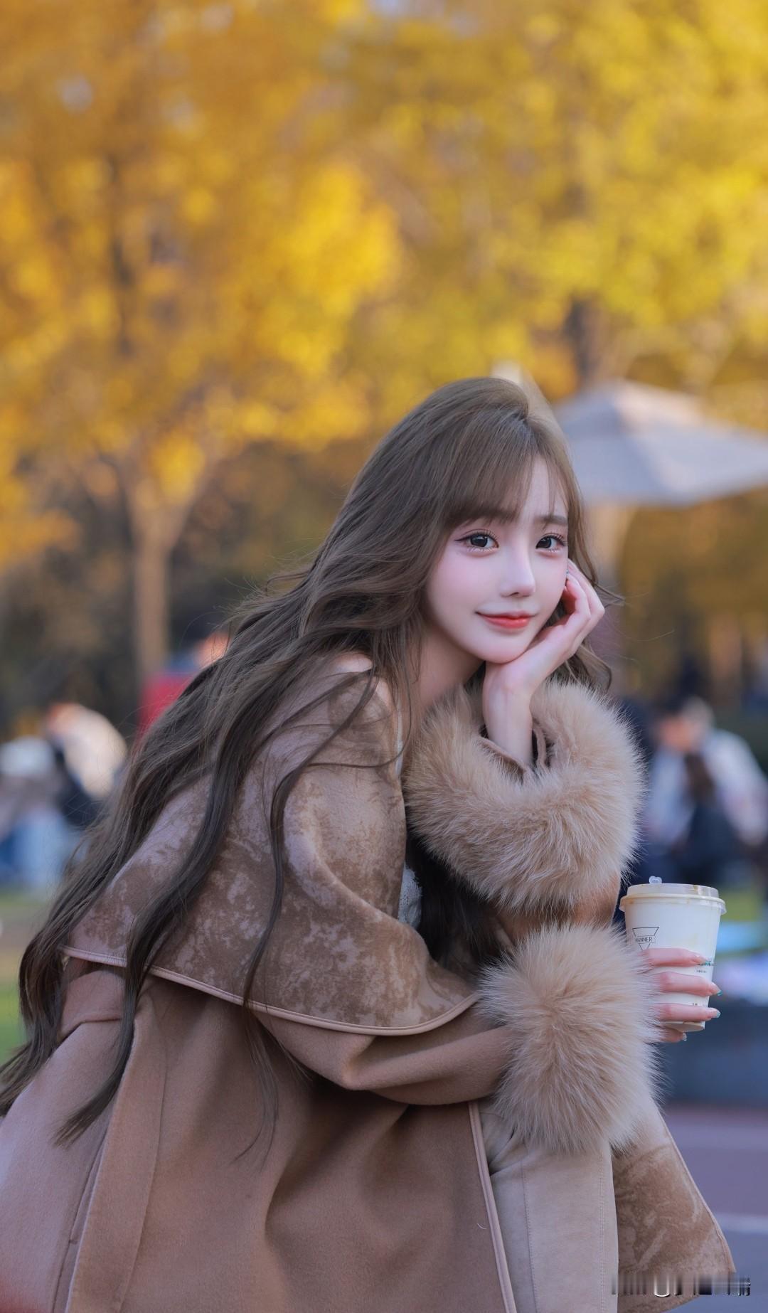 秋日暖阳下,温柔少女轻倚树旁,手捧热饮,岁月静好。