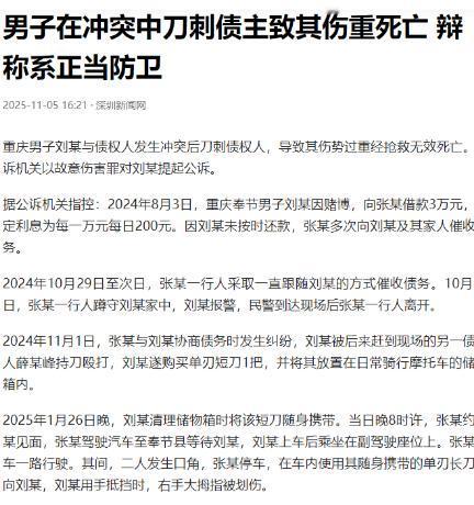 重庆,一男子借了3万元用于赌博,利息高达每日600元。由于男子到期后没钱还,遭到债主持刀刺伤了手指。男子一怒之下,无视债主的撕扯,持早就准备好的刀具,对债主的上半身持续捅刺,后债主经抢救无效死亡。案发后,男子坚称自己是正当防卫,但公诉机关却以故意伤害罪提起公诉。 张某是刘某熟识的朋友,但并非真正意义上的好友。平时言谈间带着几分威胁的意味,让刘某即使在借钱时也有些忐忑。 那天见面时,张某坐在茶馆靠窗的位置,眼神凌厉,手里随意摆弄着一支笔,像是在衡量刘某的每一个动作。 “你确定要借三万?”张某的声音不大,却带着不容置疑的威严。 刘某吞了口口水,声音微微发抖:“是……是的,我保证按时还。” 张某嘴角微微上扬,露出一丝笑意:“利息,你知道吧?每天六百元,不多不少。” 刘某愣了一下,心里瞬间升起一股寒意。他曾以为自己能凭借赌局赚回来一些钱,可这高得离谱的利息,让他感到呼吸都紧了几分。 最终,刘某还是点了点头。 到了还款日,他才真正感受到债务的压力。刘某深知自己拿不出这笔钱,但他没想到张某的手段会如此极端。 起初只是电话催款,短信催款,可很快,张某开始频繁出现在他的生活里。他在街角等着刘某,下班路上也会“偶遇”,甚至在刘某家门口蹲守,像阴影一样紧紧跟随。 每一次敲门,每一次电话,都让刘某的心跳加速,他甚至开始怀疑自己的生活是否还能回到从前。 一天傍晚,刘某回到家门口,发现张某带了几个人蹲在楼下。那几个人的目光阴沉,像猎人盯着猎物般不放。 刘某深吸一口气,试图绕道而行,但张某大步迎了上来,声音冰冷:“钱准备好没?”刘某摇头,试图退回家中,却被张某死死堵住。 “你这是在耍我?”张某咆哮着,他的随行人围了上来,气氛逐渐紧张。 刘某心里一阵恐慌,他看向家里的窗户,家人正在窗边张望,眼神里满是担忧。那一刻,他明白,自己必须做点什么,哪怕是冒险。 最终,他选择报警。民警迅速赶到,张某等人才匆匆离开。刘某以为危机暂时解除,但事态并未因此结束。 隔天清晨,张某又出现在他家门口,这次更激烈——他带着的随从冲上前,直接拉扯刘某。 混乱中,一把刀划过刘某的手指,鲜血瞬间染红了手掌。剧痛让他咬紧牙关,心里的恐惧与愤怒瞬间膨胀到极点。 刘某知道,如果这次退让,不仅是他自己,家人也将继续受到威胁。他的手抖着从抽屉里拿出那把早就准备好的小刀,刀刃在昏暗的光线下闪着寒光。 张某显然没有预料到刘某会反击,他咆哮着扑上来,企图再次控制局面。然而刘某的愤怒已无法被压制,他的动作快而果断,刀尖连续刺向张某的上半身,每一次都带着压抑已久的恐惧和绝望。 血液喷溅在地板上,浓烈的铁锈味让整个房间沉重而窒息。张某的同伙惊呼着后退,整个场面在几秒钟内彻底失控。 刘某的心跳如雷,手中的刀像有自己的意识般不停舞动,直到他察觉张某再也没有动弹,他才愣住,整个人瘫倒在血泊边,手臂在颤抖,呼吸急促,心里充满了不敢相信的震惊。 警笛声再次响起时,一切已经无法挽回。张某因失血过多抢救无效死亡,刘某被带上警车时,脑子里一片空白。 他反复在心里回想着整个过程:那种被人盯梢、被人威胁、家人处在危险之中的恐惧,他真的只是想保护自己和家人。可是,法律的界限并不会因恐惧而模糊。 在警局里,他低着头,手心仍残留着未干的血迹。民警的目光严肃而冰冷,询问他事发经过时,他的声音颤抖而坚定:“我只是想保护自己和家人,我没有想杀他……” 然而公诉机关看到了另一种事实:刘某持刀连刺数次,最终导致张某死亡。这种行为是否已超出了正当防卫的范围?最终,公诉机关以故意伤害罪提起公诉。