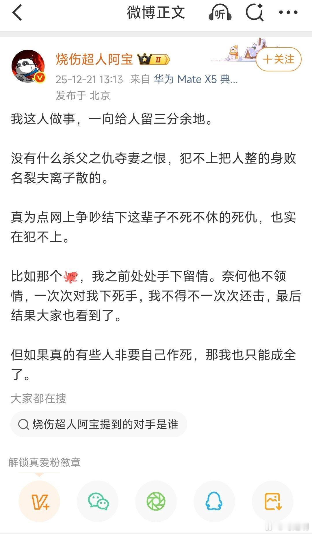 这篇微博有点意思,这是警告让他补缴税款和滞纳金的举报人,还是警告批评他的网民?其实吧,学习阿宝好榜样,也是不错的选择,毕竟能补缴税款和滞纳金80余万元的网民是极少数。 只是这种行为老是麻烦税务执法机关,貌似不好吧?