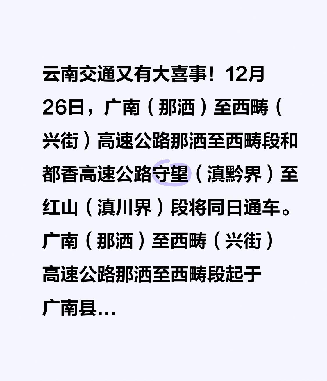 云南交通又有大喜事!12月26日,广南(那洒)至西畴(兴街)高速公路那洒至西畴段和都香高速公路守望(滇黔界)至红山(滇川界)段将同日通车。 广南(那洒)至西畴(兴街)高速公路那洒至西畴段起于广南县那洒镇,止于西畴西收费站,计费里程42.199公里,还会同步开通蚌峨匝道收费站。 客车普通路段通行费0.5元/车·公里、桥梁隧道1.4元/车·公里,货车等也有相应标准。 此前那兴高速西畴至兴街段通车,让西畴县城到兴街镇时间从30分钟缩至10分钟。这次通车又将大大改善出行,期待! 同一天通车的都香高速公路守望(滇黔界)至红山(滇川界)段,更是意义非凡。它宛如一条巨龙,横跨在滇黔川三地的大地上,极大地缩短了区域之间的时空距离。 都香高速此段的开通,将进一步完善云南的高速公路网络布局,加强云南与周边省份的经济交流与合作。对于沿线的居民来说,出行变得更加便捷高效,无论是走亲访友还是外出旅游、商务往来,都不再受路途遥远和交通不畅的困扰。 这两条高速公路的通车,就像是为云南插上了腾飞的翅膀。不仅带动了沿线地区的旅游业发展,让更多的人能够领略云南的美景和风情,也促进了资源的合理配置和产业的协同发展。未来,相信云南在这样便捷交通的助力下,经济社会发展将迎来新的辉煌。让我们一起为云南交通的腾飞喝彩! 马关至西畴高速 都香高速 那兴高速 高速公路 交通