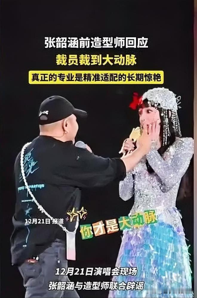 张韶涵演唱会幽默回应“裁员裁到大动脉” 12月20日,张韶涵在惠州演唱会现场,与造型师姜成皓互动,巧妙回应“裁员裁到大动脉”争议。她笑着抛梗:“你不是被开除了吗?”姜成皓立刻回应“我才是造型师”。随后张韶涵吐槽“他们要我百变,又不要我改变”,精准道破艺人面对公众期待与自我突破的两难,两人默契互动,成功化解舆论风波。