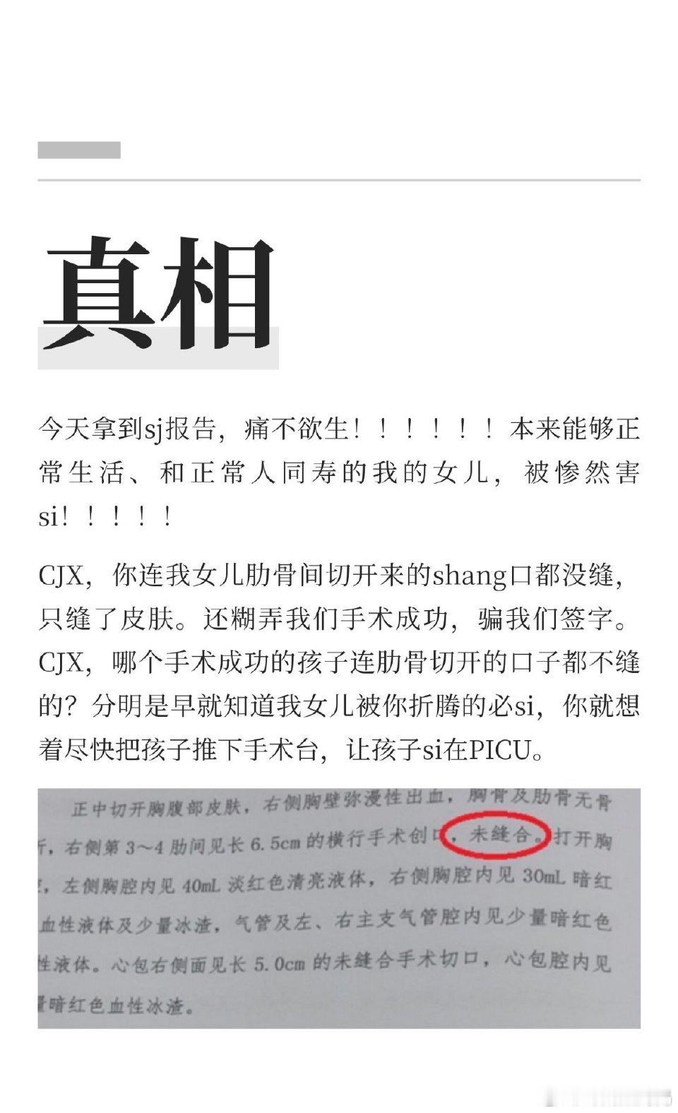 小洛熙事件追问手术室应该有监控吗法医刘良团队的尸检报告是关键铁证尸检报告出来了 孩子没有房缺,心脏彩超写的有房缺,说没有那个病写有那个病,所以从做彩超那一刻起就开始骗,小孩是血流干而死的,伤口有6.5cm都没有缝!!!但是他出手术室说手术成功补了两个缺口都补了!!!!!所以从做完心脏彩超那一刻就已经注定了命运……这怎么释怀啊!!!!!!!!