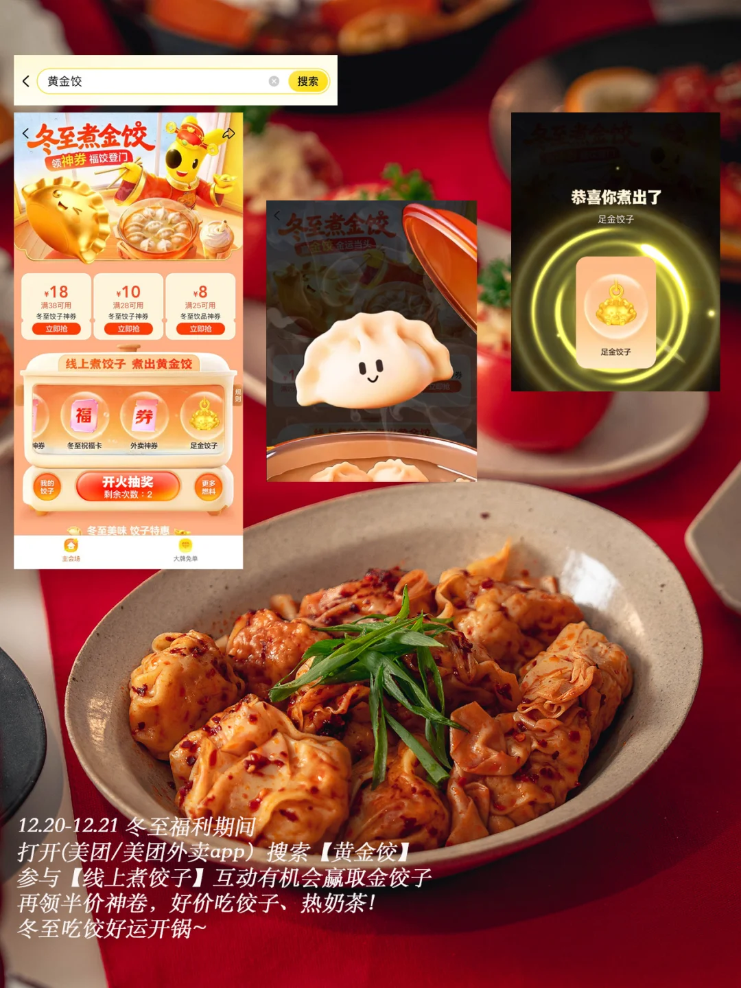 ❶煎饺&红油干拌饺 ❷红豆汤圆 ❸米糕 ❹柿柿如意饭 ❺柿柿如意红薯酸奶荷兰松饼 ❻芒果糯米饭 ❼避风塘炒虾 ❽山楂炖排骨 ❾橙香鸡翅 ❶⓿梭子蟹 ❶❶ 山楂橙汁气泡水 - 生活悄悄给我贴上“老式人类”的标签 懒得追潮流赶热点 偏爱宅家的安静和工作的踏实 冬至一到,就该换种节奏 长夜漫漫,正适合三两好友围坐 白饺香醋,汤圆热粥 糕点菜肴摆满桌 蜡烛点亮的瞬间 这个冬至才有滋有味 12.20-12.21上美团/美团外卖搜「黄金饺」 线上煮饺抽金礼,半价神券薅不停 热乎饺子配热饮,温暖过冬没差啦~