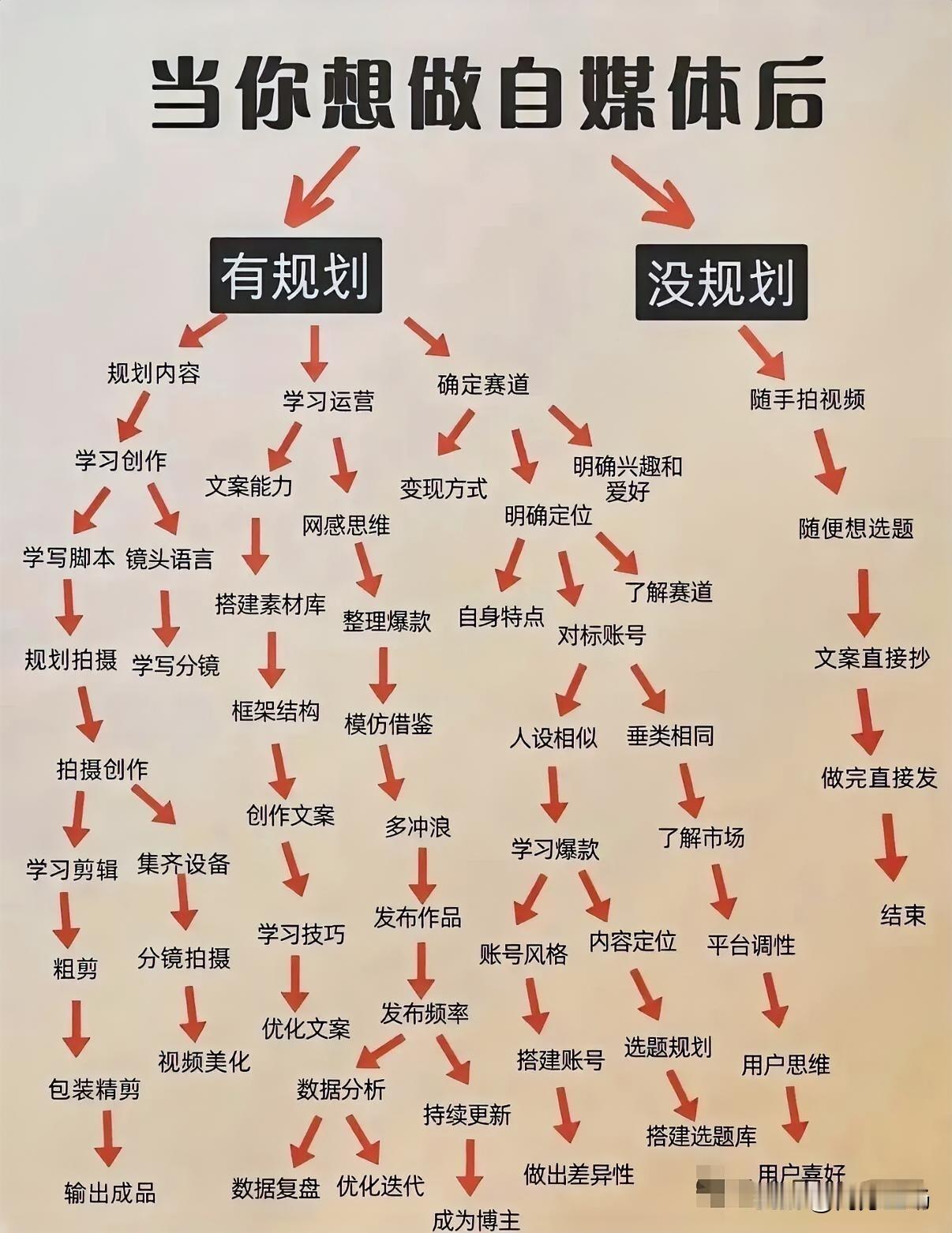 当你想做自媒体后,有规划和没有规划的区别确实很大,良好规划决定你是探险家还是迷失者。 有规划的人,像带着地图的探险家:定位清晰、内容垂直、更新稳定,每一步都积累影响力。三个月就能涨粉不少,半年实现变现,成长肉眼可见。 没规划的人,像在迷雾中摸索:今天发美食,明天晒日常,流量全凭运气。坚持不久就迷茫放弃,只剩一句“自媒体不适合我”。 规划并不是束缚,是让你在正确的路上有效努力,正所谓磨刀不误砍柴工。 自媒体 自媒体创作思路 自媒体误区 自媒体解析 自媒体破局指南