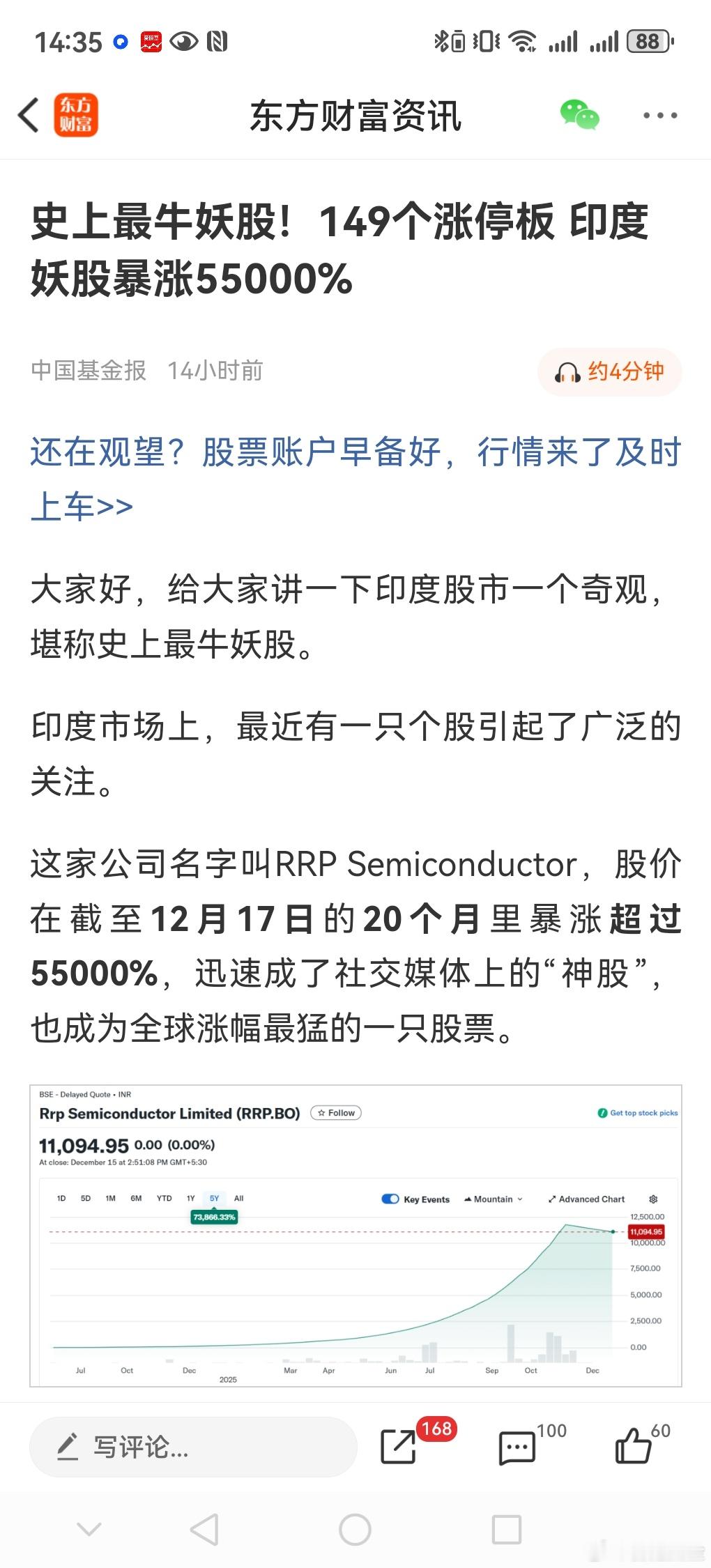 史上最牛妖股!20个月,149个涨停板 印度妖股暴涨550倍。秒杀巴菲特懂王等一众世界高手。大家好,给大家讲一下印度股市一个奇观,堪称史上最牛妖股。印度市场上,最近有一只个股引起了广泛的关注。这家公司名字叫RRP Semiconductor,股价在截至12月17日的20个月里暴涨超过55000%,迅速成了社交媒体上的“神股”,也成为全球涨幅最猛的一只股票。a股印度妖股股票