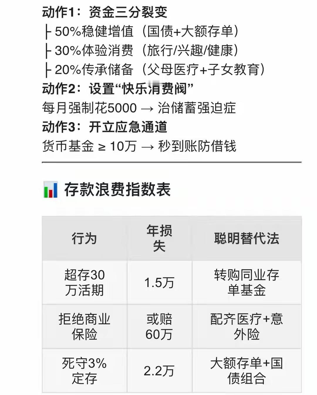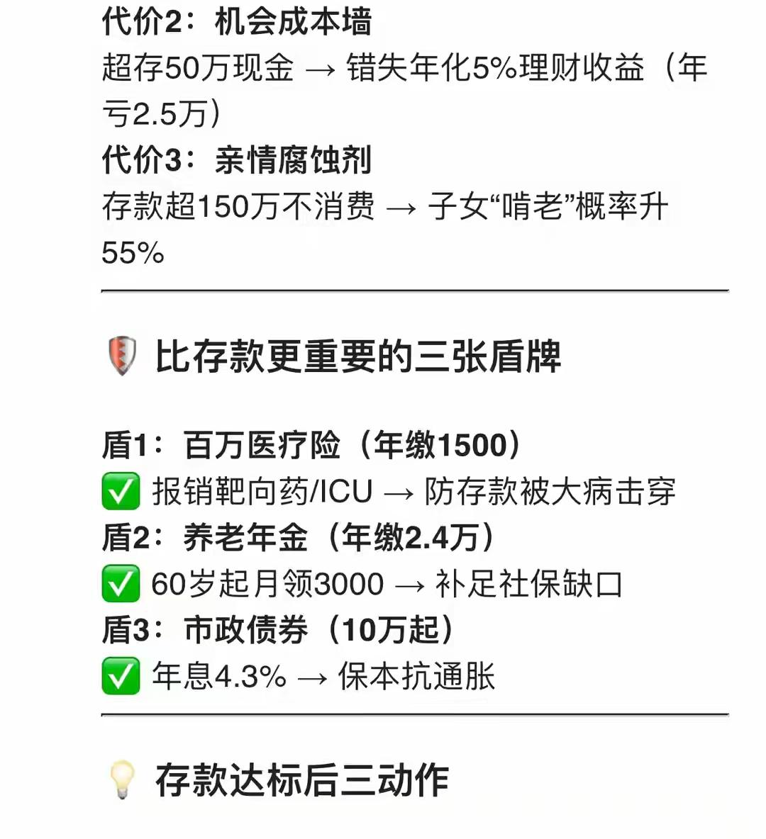 财富终极顿悟:45岁存到这个数,再多就浪费 Deepseek存款黄金线:45岁存到这个数,再多就是给医院打工! 存款超过 “舒适封顶线”,每多1万元都在支付 “焦虑税”: 担心贬值,害怕被借,恐惧投资失误… 45岁后顶级的理财,是把超额存款转化成体检报告上的箭头全阴,和家人在三亚的落日笑声。 干货分享 知识分享