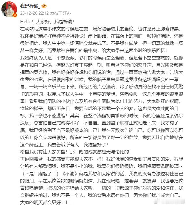 梓渝南京首场演唱会结束后发长文昨天晚上梓渝南京首场演唱会结束后发长文。回顾两小时的演唱会快乐回忆!闭眼仍能清晰回放每一帧舞台画面不舍得当晚舞台,像一场梦一样美好!梓渝人生中第一场演唱会圆满完成了!期待小鱼下一个舞台见!2025娱乐年终盘点非正式跨年派对