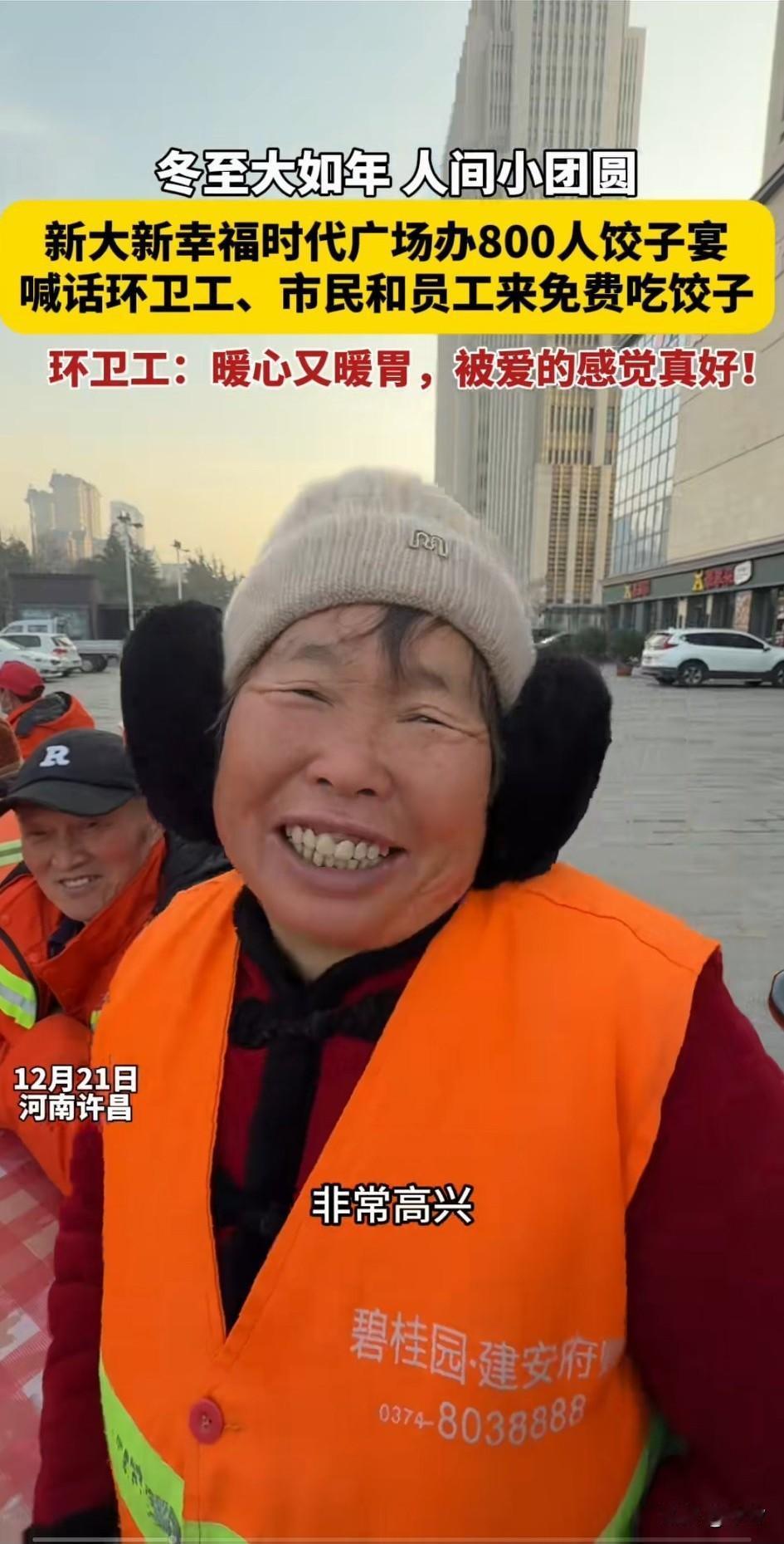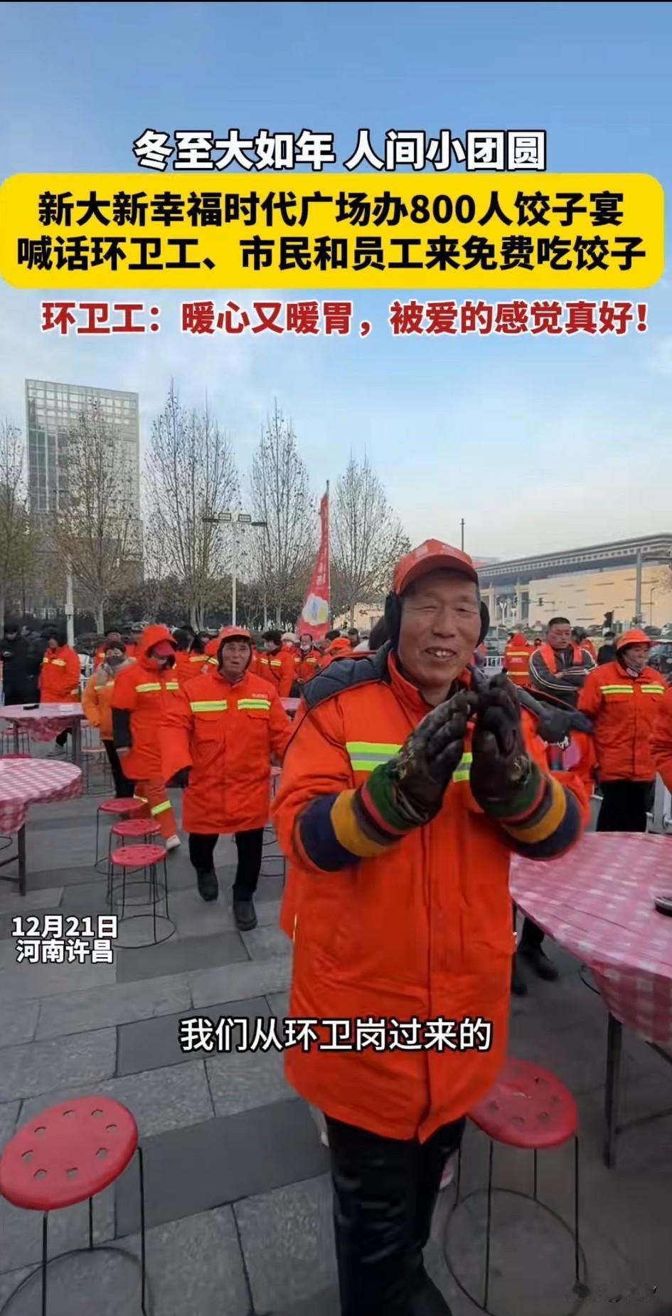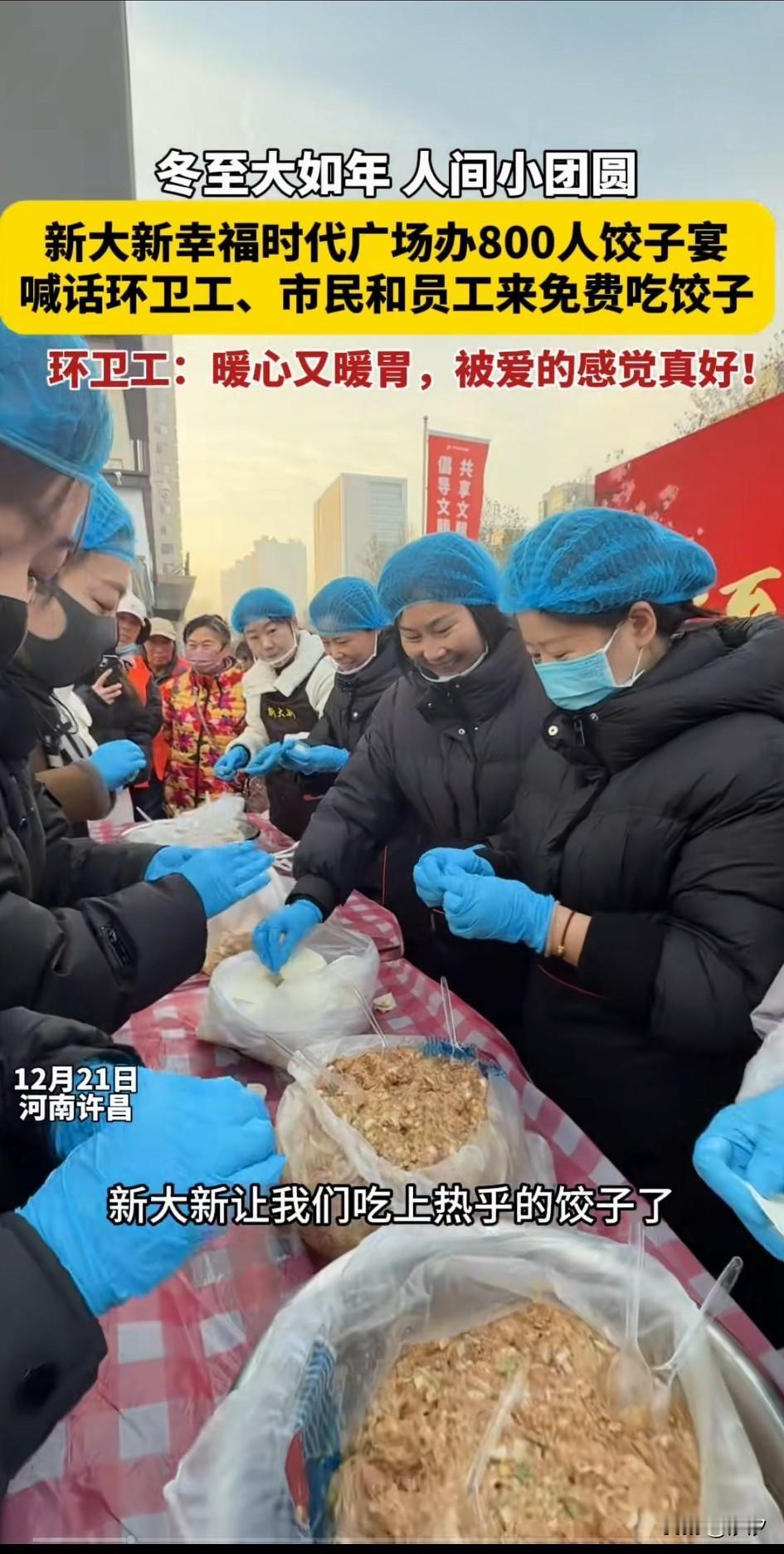 这样的冬至才有意义, 许昌新大新幸福时代广场, 组织工作人员现场包饺子, 并且置办了800人的饺子宴, 邀请环卫工市民和员工共同来吃饺子, 虽然现场非常寒冷, 但是工作人员的热情感染了他们, 也感动到了许多环卫工, 他们自己也没有想到, 居然会有人请他们吃饺子, 他们都是从环卫岗位上风尘仆仆赶来的,现场也有很多人围观, 这样的活动非常值得, 这才是城市该有的温暖, 环卫工都是非常辛苦的, 他们为城市的整洁做出了贡献, 拿着非常微薄的薪资, 是非常不容易的一批人, 大妈对记者表示, 这个冬至让她非常感动, 因为她吃上了新大新的饺子, 许昌这个时代广场的工作人员温暖了这批环卫工! 冬至快乐 时代广场饺子 许昌自助鞋包 喜东来饺子 荣超时代广场 许昌万象新天