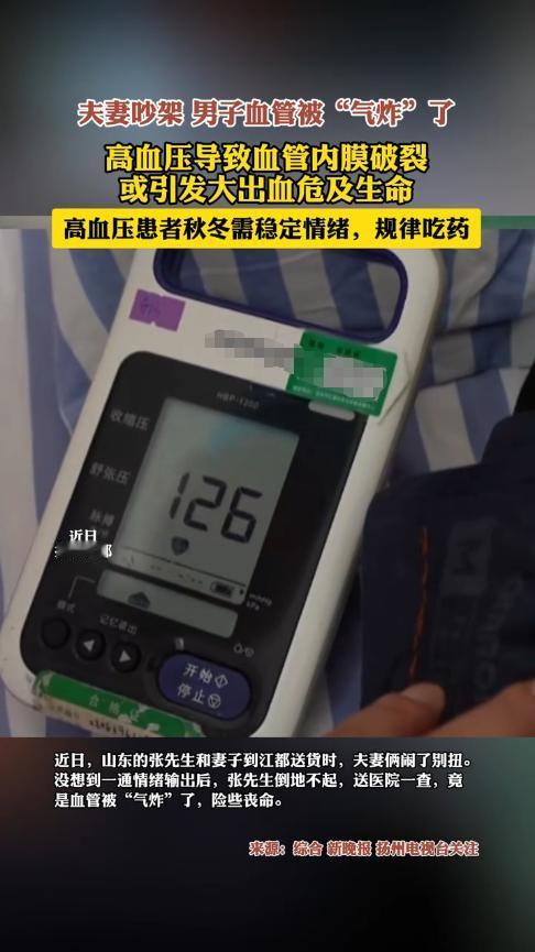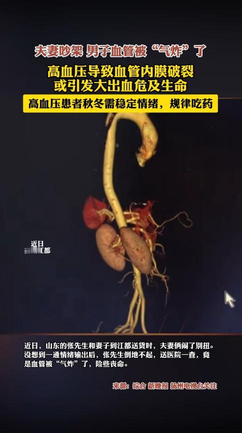 悲剧还是发生了!12月4日,江苏扬州,一男子送货途中,和妻子发生争吵,情绪变得异常激动,突然,他感觉心口传来剧烈疼痛!整个人痛苦地蜷缩在地上,妻子急忙叫了救护车,检查后发现,男子的血管被“气炸”!古人云:气大伤身。 良好的心态很重要,如果长期被消极情绪影响,人的抵抗力就会下降,最终生一场大病,不仅如此,有时生气上头也会导致身体受损伤。 张先生是位货车司机,前段时间他和妻子一起来扬州送货,结果二人因一些生活琐事拌起了嘴,张先生的情绪变得越来越激动,喘气也变得逐渐困难。 突然,一阵钻心的痛从心口窝传来,张先生的脸瞬间扭曲变形,躺在地上拼命挣扎,妻子也被吓了一跳,缓过来神后立即叫了救护车。 被送往医院后,医生发现张先生主动脉的血管竟然爆了!而原因就是高血压,当时张先生情绪激动,导致血压迅速升高,最终硬生生把血管撑破了。 由于情况危急,医生立即展开了手术,最终帮助张先生脱离了生命危险。 对于高血压患者来说,平日里一定要注意自己的情绪,不要过度的紧张、生气,不然真的会把身体“气坏”的。 网友看后表示,这下知道不能随便生气了吧,差一点就把小命搭进去!以后可得控制好情绪。 信息来源:《夫妻吵架,丈夫血管当场“气炸”》纵览新闻