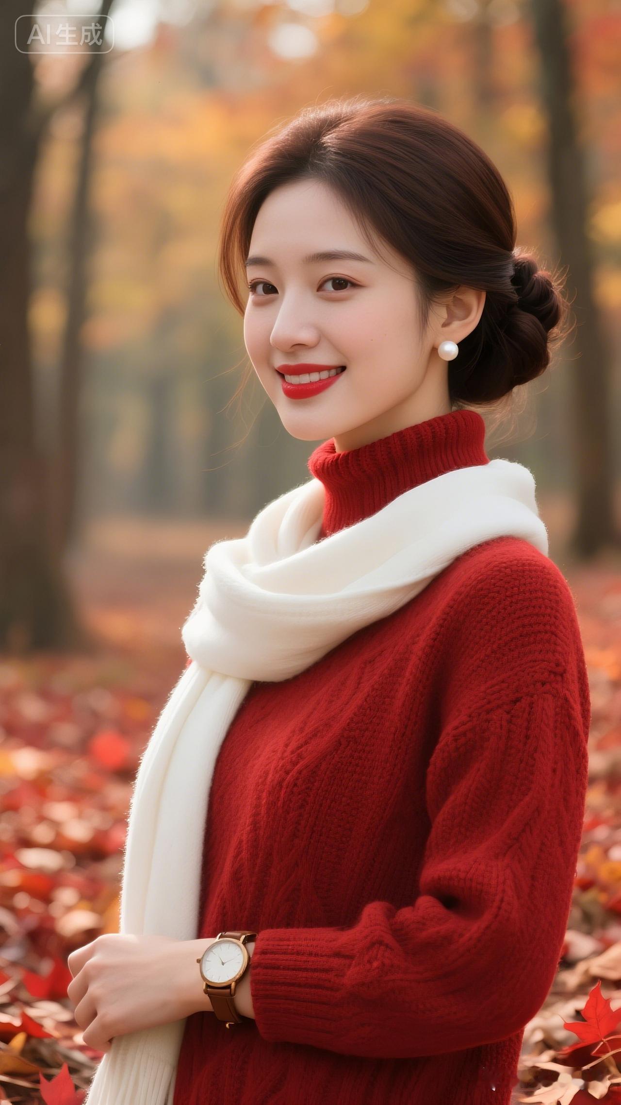 一位美女坐在树下,穿着优雅,背景是秋天的落叶。