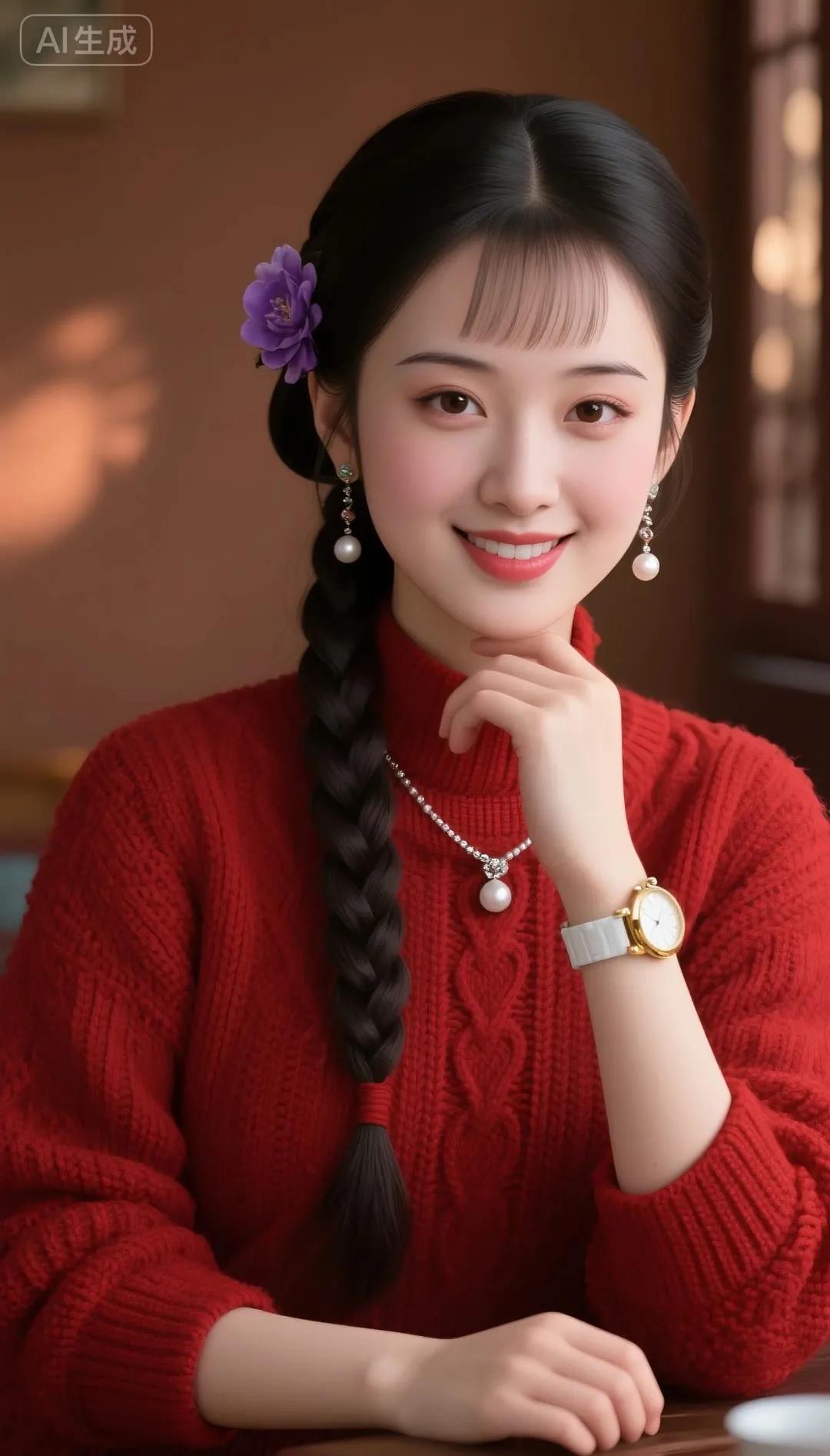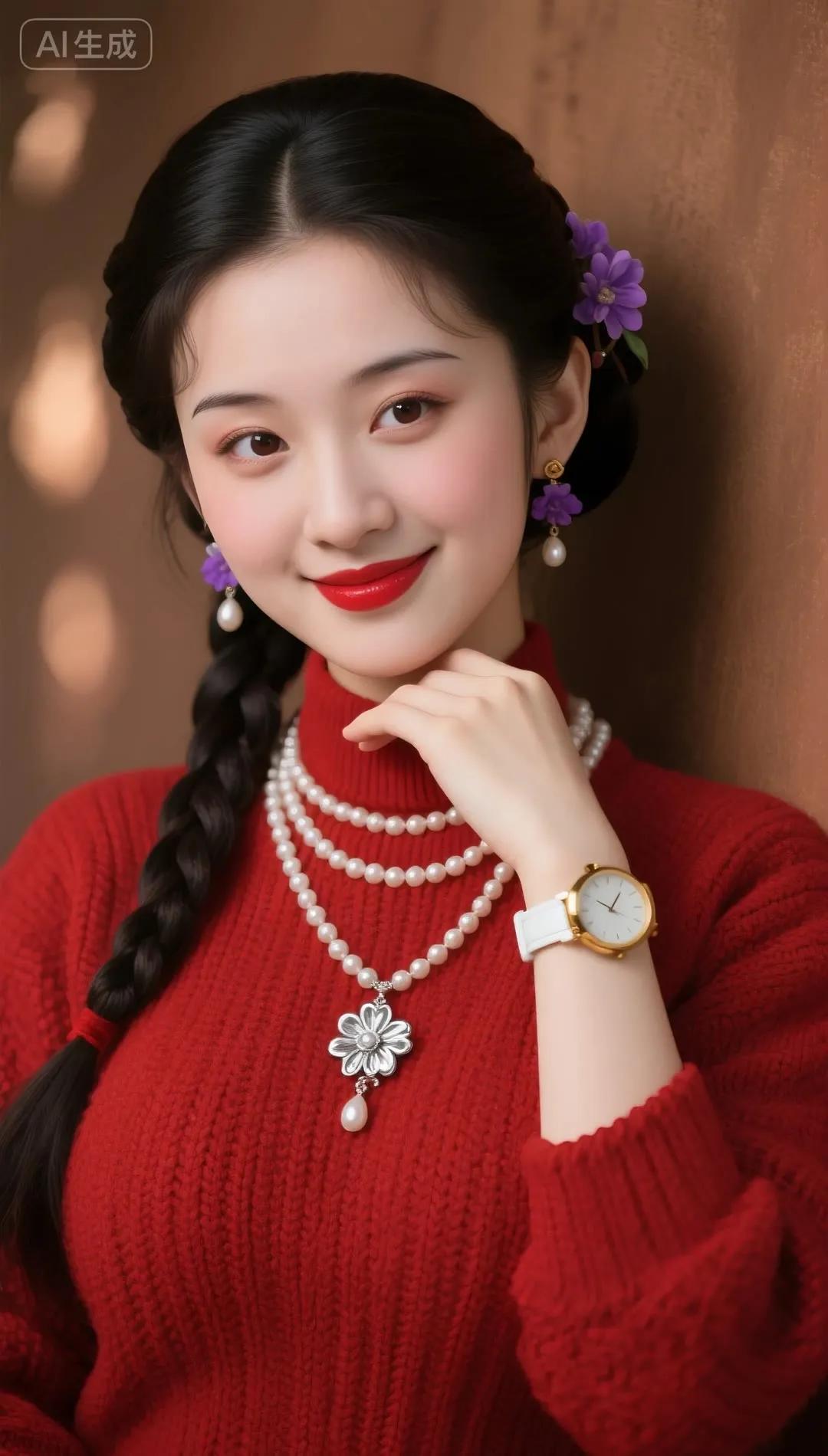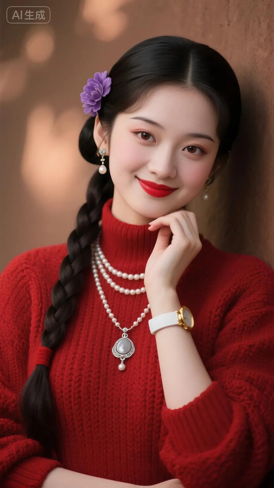 冬日暖阳下的甜美少女,红衣配珠链,尽显优雅与甜美。