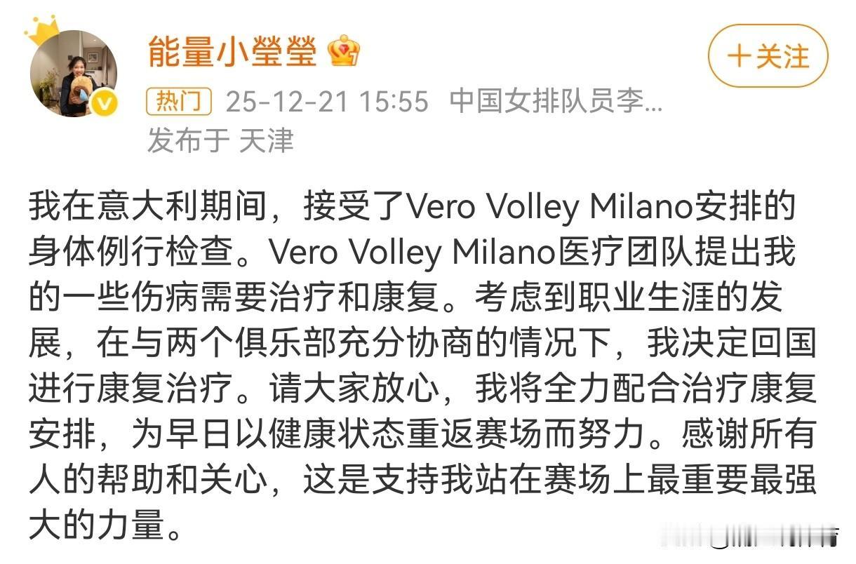 李盈莹已经回到天津。李盈莹于12月初抵达意大利,宣布加盟意甲劲旅米兰女排,可始终没有进一步出战的消息,甚至比她晚到的庄宇珊都已经在意甲联赛打了三轮比赛。不过就在刚刚终于尘埃落定,李盈莹本人宣布自己未能通过意甲联赛的体检,决定回国进行康复治疗。而且她的个人社交平台定位已经显示是天津,说明李盈莹本人已经从米兰返回天津。只能说陈方在全运会备战期间,真正是练得太狠了。当然,打完全运会能够去意大利旅游一次,借机放松一下疲惫的身心也非常好。祝李盈莹早日康复。