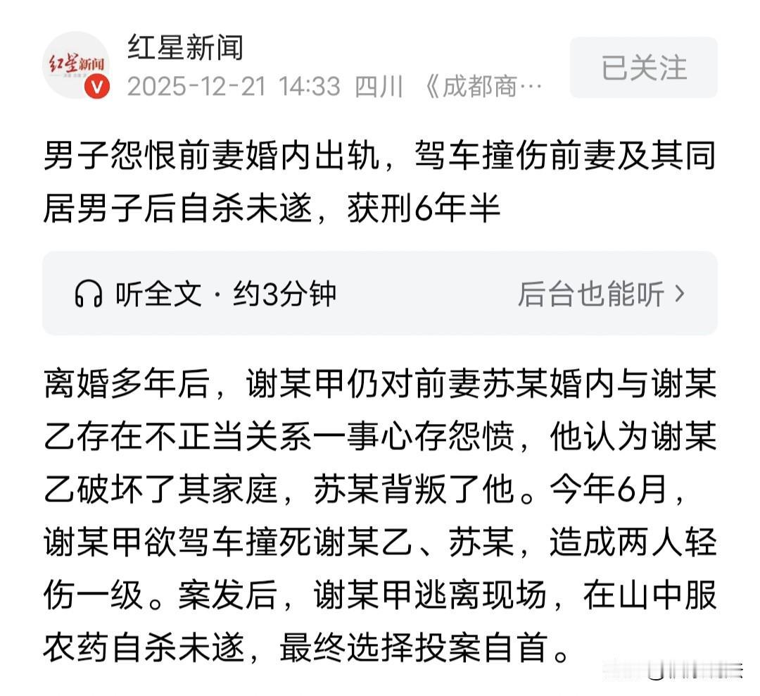 “为报复出轨的前妻值得吗?”江西宜春,男子离婚多年,见前妻和男友仍同居一起,心中一直怨恨,想弄死二人,他凌晨开小货车趁着前妻陪男友回老家为母奔丧时,直接将二人摩托车撞翻,导致二人受伤,男子吓得逃进深山,喝下农药想自我了断,结果没成功,他选择了自首,法院认为男子犯了故意杀人罪,这样判了。 谢先生离婚都好多年了,可是心里硬憋着一股气,为啥呢?就因为他的前妻苏女士和他婚姻存续期间的时候跟另一个男子谢某乙有不正当关系。 谢先生心里一直怨恨谢某乙,就是他把自己的家搅和散了,而前妻也背叛了自己,这口气他怎么都咽不下去…… 谢先生还记得,当初他与前妻协议离婚后,她就和谢某乙住到一块去了,两人倒是甜甜蜜蜜,而他像个傻子似的,家也散了,日子也没法过了。 怨恨的积累就像正在充气的气球,到了临界点一定会炸开的,谢先生也到了忍无可忍的境地。 他脑子里闪过一个疯狂的念头,他想将苏女士和谢某乙弄死,以解自己的心头之恨,因为恨,他已经失去了最后的理智。 2025年6月10日,谢先生听说谢某乙的母亲因病去世了,他眯着眼睛在心里琢磨,那家伙的老娘去世,他和苏女士一定会回老家奔丧,如果那时候在半路上开车撞他们…… 谢先生也是丝毫不顾后果,说干就干,将不利因素以及后果都抛在了脑后。 6月13号5点左右,谢先生提前开着小货车到了谢某乙回家的必经之路等着。 等了大概半小时左右,谢先生看到道路上一男子骑着摩托车载着一女子,他不禁眼前一亮,随即咬紧牙关,一脚油门猛的奔摩托车冲了过去。 谢某乙和苏女士被突如其来的小货车撞倒在地,由于冲击力很大,两人都受了伤。 撞完人后,谢先生心里也害怕了,一刻不敢停留,开着车就跑了,他跑到了深山里面,心里后悔又绝望,自己闯了这么大的祸,肯定没好下场,干脆拿出事先准备好的农药,一饮而尽,想一死了之来逃避这一切。 可是,天不遂人愿,谢先生虽然喝了农药,但没死成,他也没心情再折腾了,在6月15号凌晨,选择了投案自首。 好在谢某乙、苏女士没有生命危险,经过法医鉴定,二人都属于轻伤一级。 而这事一出,谢某乙和苏女士倒是给谢先生出具了谅解书。 你说这个谢先生既然离婚了,就放下过去,去追求自己的生活,没有必须执着于前妻一事。因为前妻的错误,他铤而走险,结果自己一念之差把自己害了。 婚姻中夫妻之间应该保持忠实义务,如果苏女士背叛了家庭,谢先生可以通过法律来追究她的责任。 在离婚时可以以对方存在重大过错多分财产但不能自己去报复,结果就是两败俱伤,或者自己踉铛入狱,别人在外面肆意潇洒,细想是不是不值得? 1、法院认为,谢先生开车故意撞向谢某乙、苏女士,导致二人轻伤一级,构成故意杀人罪。 根据《刑法》第232条规定:故意杀人的,处死刑、无期徒刑或十年以上有期徒刑;情节较轻的,处三年以上十年以下有期徒刑。 本案中,谢先生因怨恨前妻苏女士与谢某乙有不正当关系,预谋“开车撞死二人”,并选择在对方奔丧时蹲守撞击,其主观目的明确指向剥夺他人生命,符合故意杀人罪的构成要件。 尽管最终仅造成两人轻伤一级,但这是因意志以外的原因(如车辆撞击力度、被害人躲避等)未致死亡,故认定为犯罪未遂。 但有人问,为啥谢先生不构成故意伤害罪呢? 因为,谢先生是有预谋的、也有该行为方式,比如他高速撞击摩托车,及事后自杀举动,均表明其具有杀人故意,因此法院以故意杀人罪(未遂)定罪。 2、法院认为,谢先生不构成自首。 根据《刑法》第67条规定:犯罪以后自动投案,如实供述自己罪行的,是自首,可从轻或减轻处罚;其中,犯罪较轻的,可免除处罚。 法律方面,自首需同时满足“自动投案”与“如实供述”两个条件。 但谢某甲虽然投案,但庭审中,他否认杀人故意,未如实供述核心犯罪事实,故不认定自首。 不过,法院认为考虑到谢先生主动投案,加上谢某乙、苏女士对他出具了谅解书,决定酌情从轻处罚。 最终,法院判决:谢先生犯故意杀人罪,判处有期徒刑6年6个月。 一审判决后,谢某甲不服上诉,二审维持原判。 你觉得谢先生这么做值得吗?