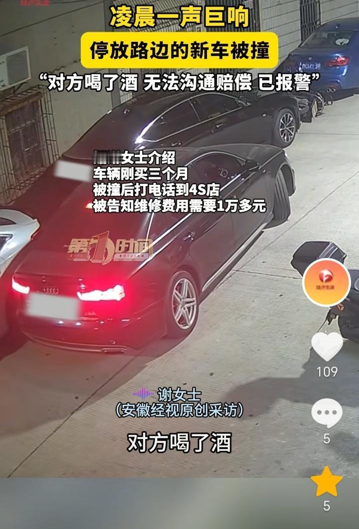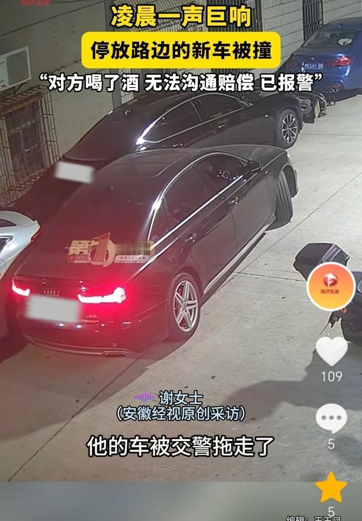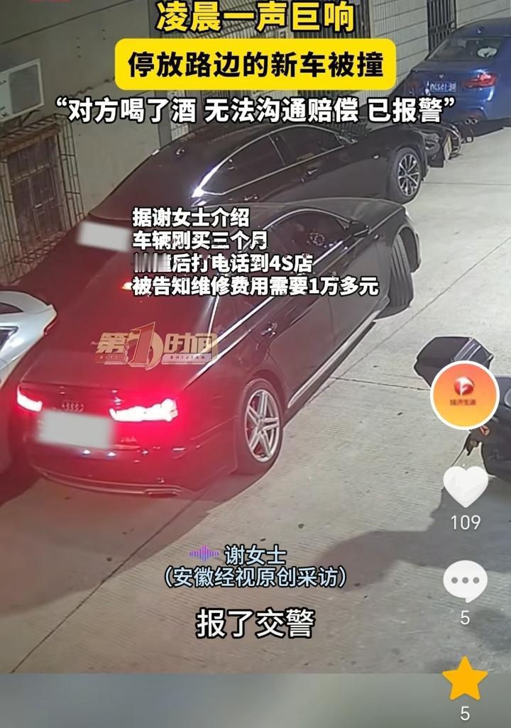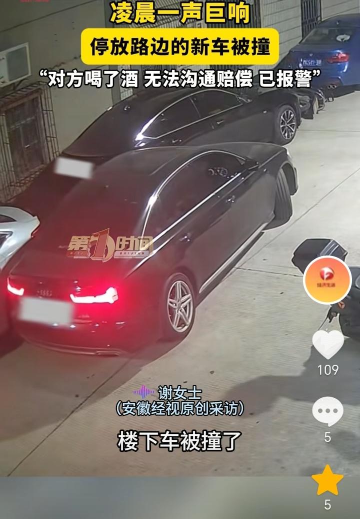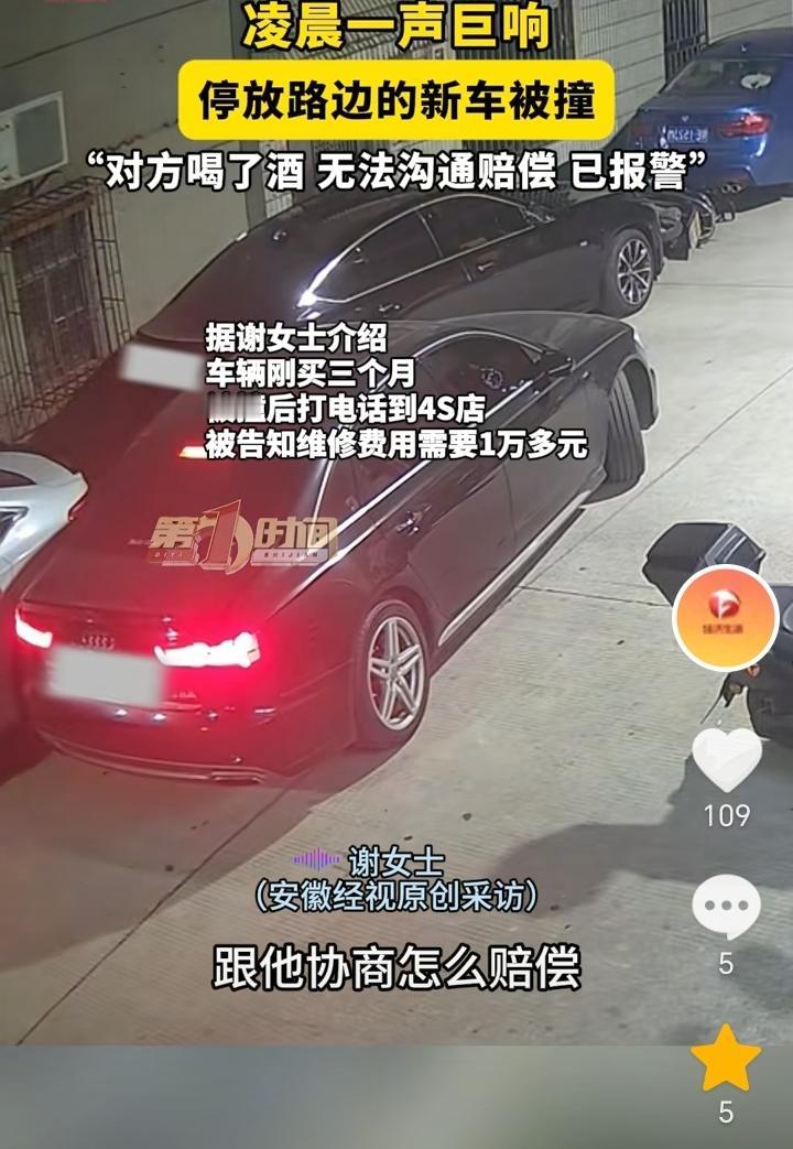 “人在家中坐,祸从天上来”!广东惠州,女子把才买三个月的新车放在楼下,凌晨一点多听到一声巨响,结果一看发现自己楼下停的车被撞了,当时女子就下去和对方协商赔偿事宜,没想到对方喝了酒根本沟通不了,女子打电话到4S店被告知维修费需要1万多元,女子就选择了报警,目前对方车辆被拖走,后续正在处理。 女子这算是“人在家中坐,祸从天上来”,她怎么也不会想到,自己车在楼下停的好好的,结果被撞了,归根到底也是因为对方酒后驾驶,要是对方没有喝酒肯定也不会出现这种情况。 对方全责是无可厚非的,只是可惜女子才买三个月的车就要被修理了,不过事情已经发生也是没有办法,只有等待对方赔偿修理。 喝酒不开车,开车不喝酒,男子这次也是幸运,好在人没事,如果下次在酒驾可能就没这么幸运了。