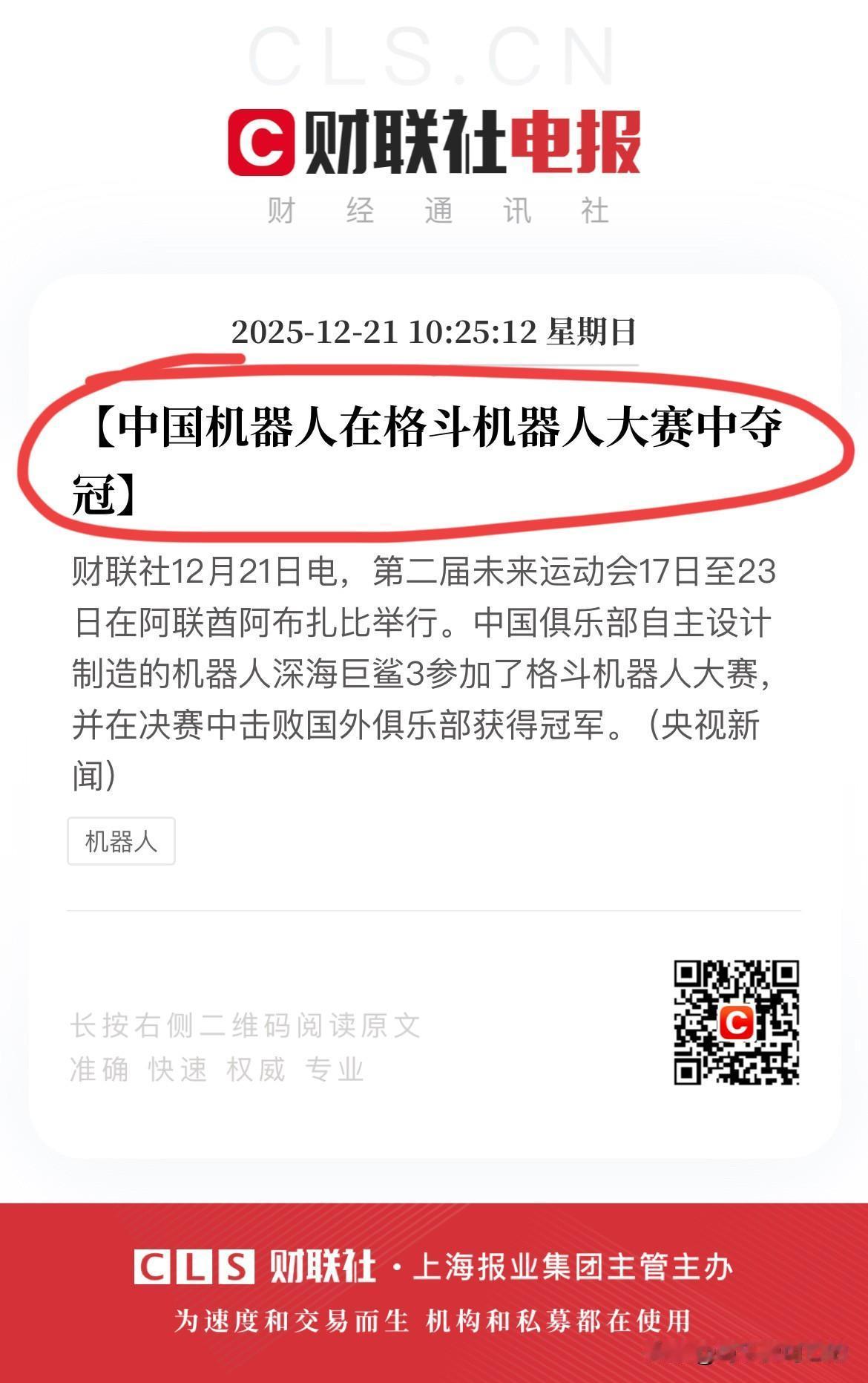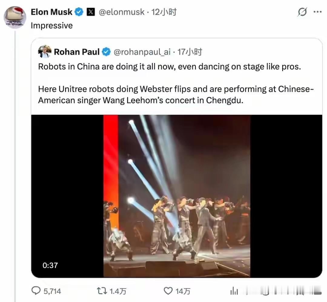 人形机器人迎多重利好,明天能否起飞? 利好1、王力宏演唱会上出现了6台宇树人形机器人伴舞并完成了高难度的后空翻动作,这一消息在网上引起广泛讨论。 不仅如此,马斯克居然也关注到了该视频,他在转发该视频的时候并评论称:“Impressive(令人印象深刻)! 过年的时候宇树机器人尚需要搀扶,年底的时候居然已经能跳舞并完成高难度动作,国内人形机器人的发展不可谓不快! 利好2、中国俱乐部自主设计制造的机器人参加了阿联酋阿布扎比举办的格斗机器人大赛并获得了冠军! 格斗机器人大赛夺冠无疑证明了国内机器人水平已经是国际领先了! 另一方面,人形机器人板块已经调整较长时间,多数个股已较前期高点下跌20%以上,调整幅度还是比较深的,有一定的反弹需求! 不过人形机器人明天究竟能否起飞还要看市场能否买账,各位股民还是谨慎参与!