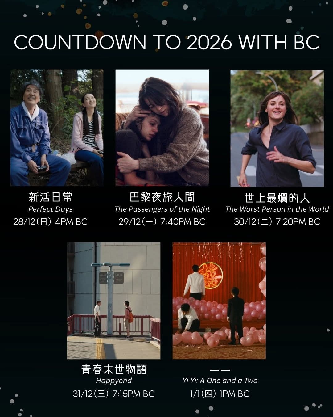 香港影讯 百老汇电影中心年终岁尾特别准备了5部电影来告别2025年,迎接2026年,12月28日起每晚放映一部。
