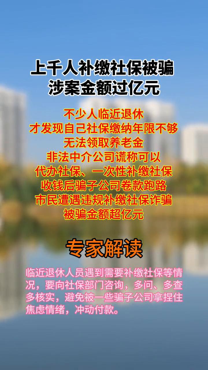 上千人补缴社保被骗,涉案金额过亿元。 不少人临近退休才发现自己社保缴纳年限不够,无法领取养老金。非法中介公司谎称可以代办社保、一次性补缴社保,收钱后骗子公司卷款跑路。市民遭遇违规补缴社保诈骗,被骗金额超亿元。 专家解读:临近退休人员遇到需要补缴社保等情况,要向社保部门咨询,多问、多查、多核实,避免被一些骗子公司拿捏住焦虑情绪,冲动付款。