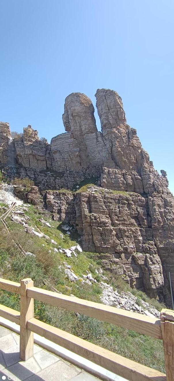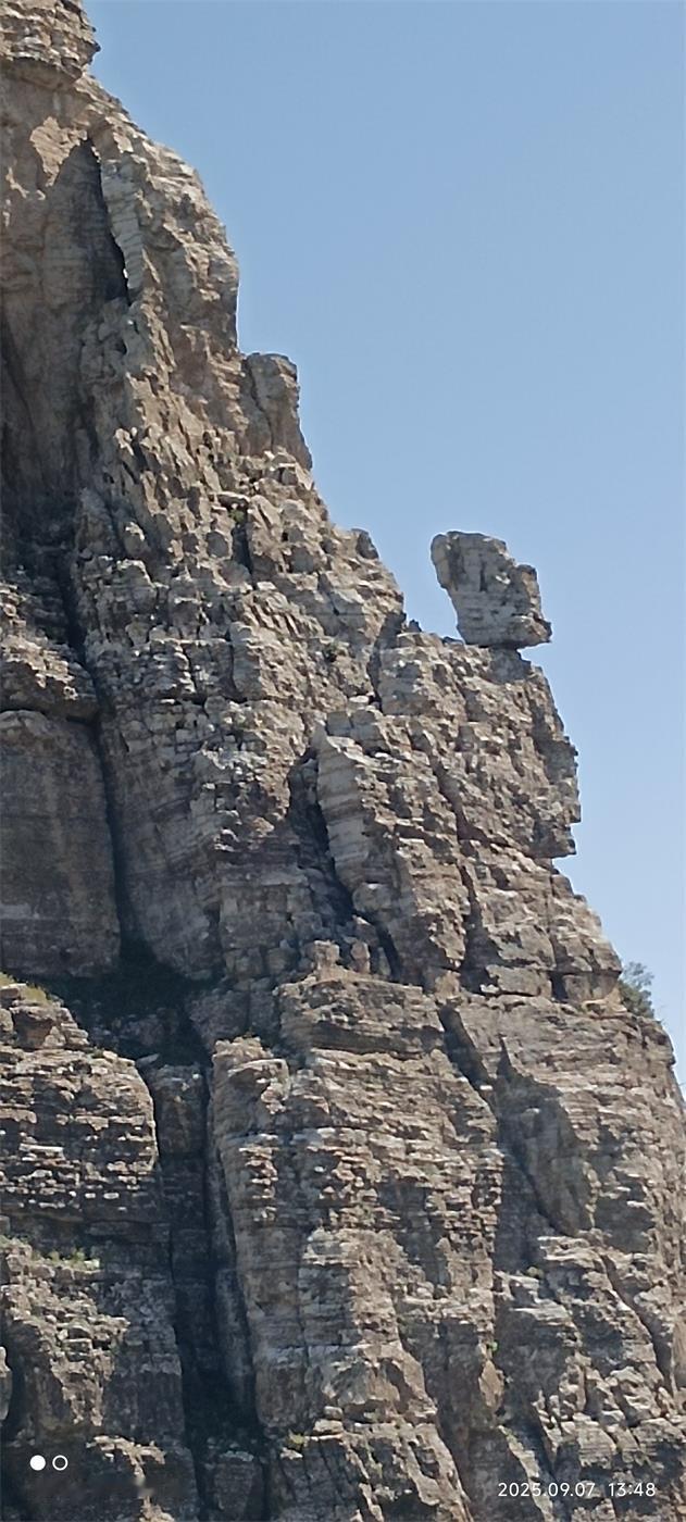 不知大自然的巧手是用什么技巧安排的——这块巨石一半凌空,一半平托在崖壁凸出的平台上。它默默的守望着群山千年万年。 远看像微微后仰的人头部,下巴是悬空的,后脑部位向后仰着,一空悬一后仰,正好保持了石头的平衡。鬼斧神工也罢,这自然的造化! 由于匆忙,没有细看有没有景区的说明牌,只是把这奇特定格在手机照片里。 这是哪里呀,白石山景区的西部观赏到的。