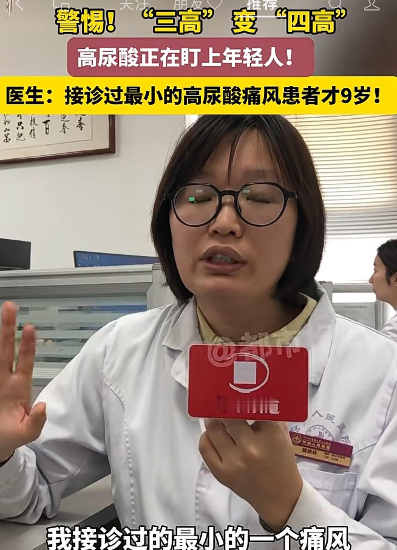警惕!医生说,高尿酸已经盯上青少年,这位医生说,她接诊的患者里,最小有9岁小孩得高尿酸,很多都是二三十岁的年轻人,这位医生强烈呼吁,年轻人不要经常喝碳酸饮料与奶茶,不要吃高油高糖食品,不要觉得自己年轻,就可以胡吃海喝!